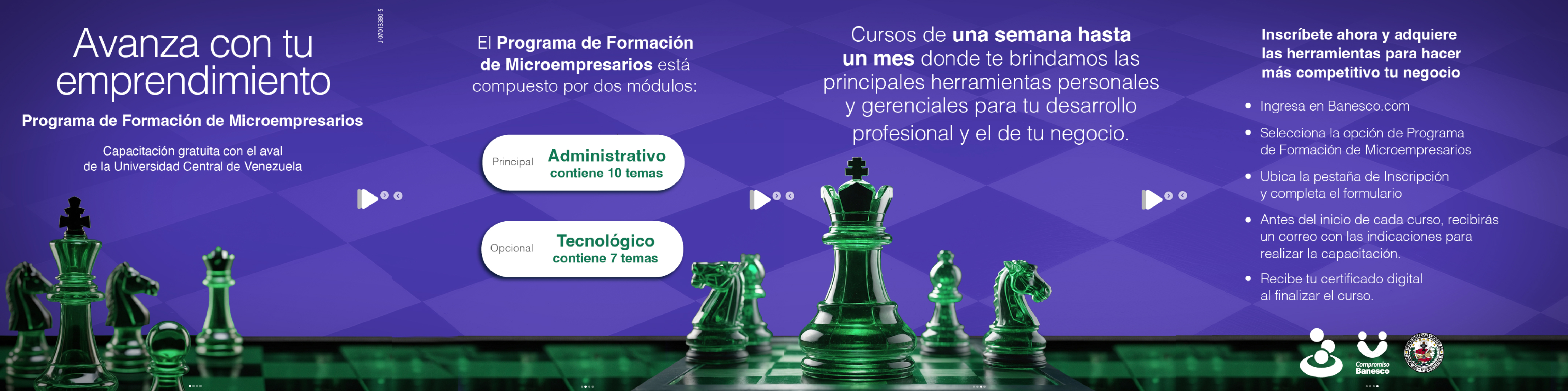 Sigue la ruta para capacitarte y recibe tu certificado digital con el aval de la Universidad Central de Venezuela. Ingresa a www.Banesco.com - Programa de Formación de Microempresarios - Quiero Registrarme