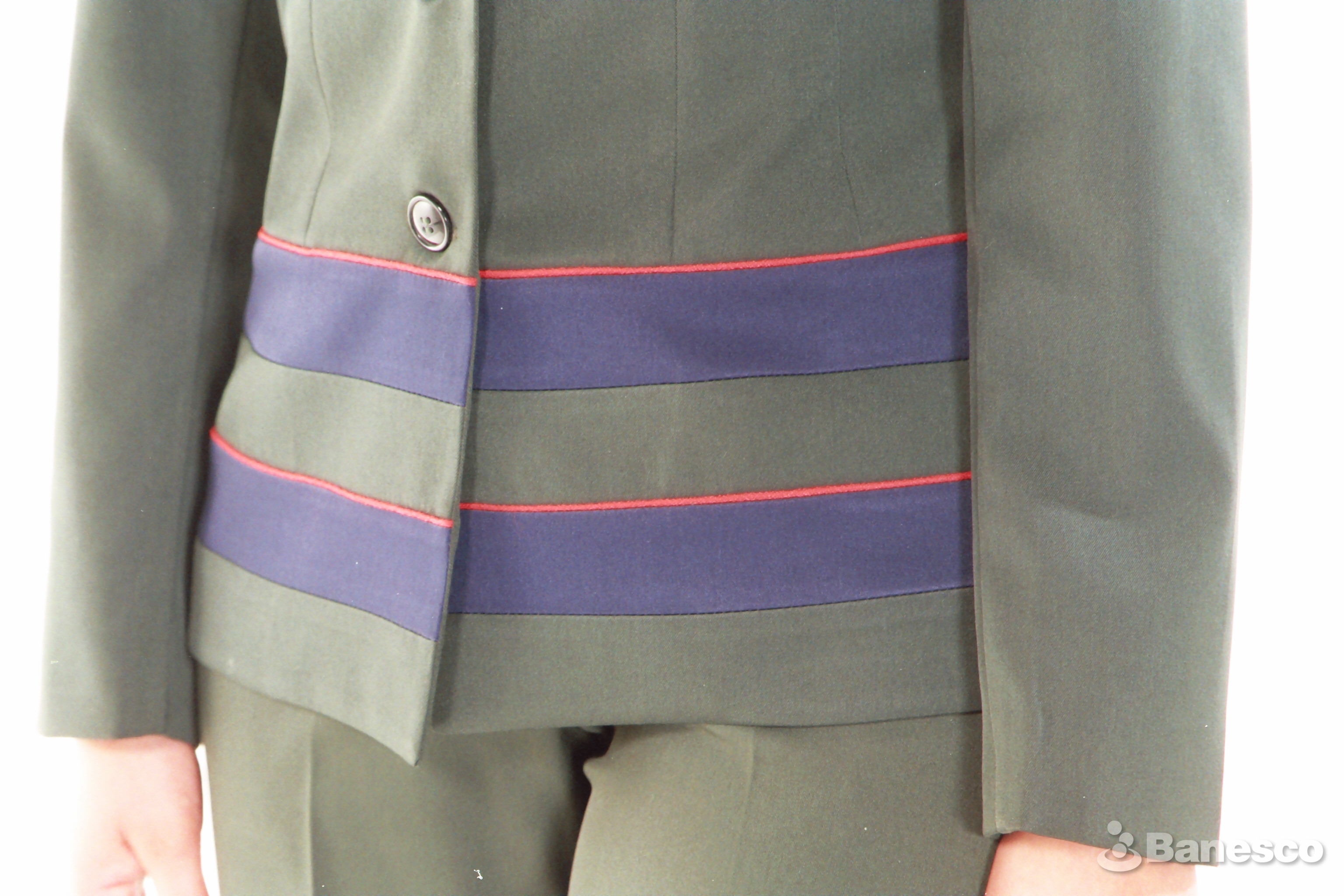 Blazer de color verde con 2 líneas rojas y 2 líneas azules horizontales.