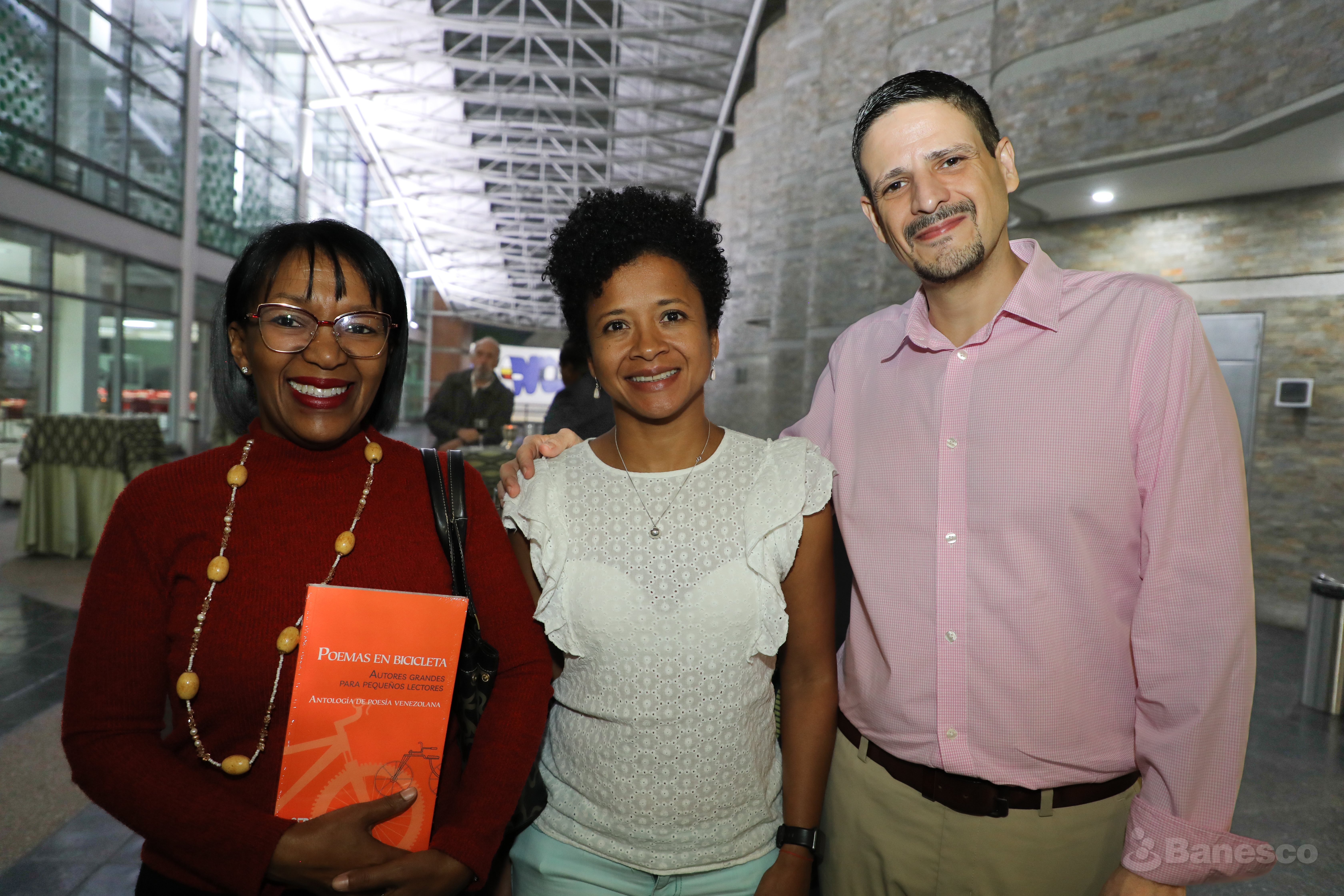 Carmen Verde Arocha junto a Álvaro Mata celebrando durante la presentación del libro "Poemas en bicicleta. Antología de poesía venezolana", evento realizado en las instalaciones de Ciudad Banesco.