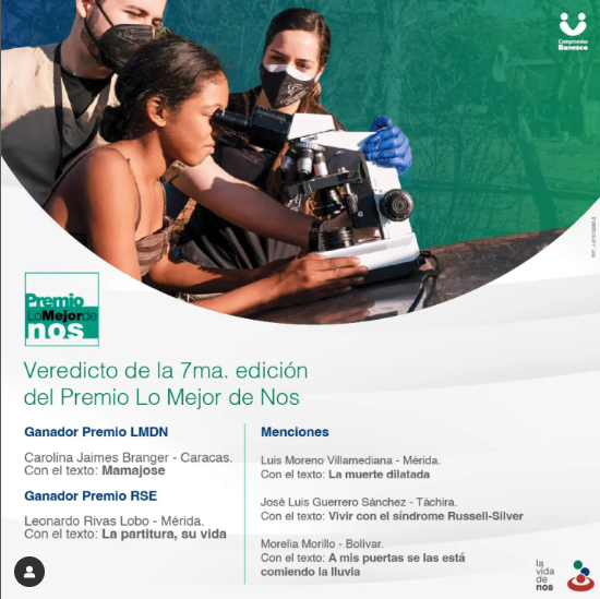 Asimismo, felicitamos a los finalistas Luis Moreno Villamediana (@humorvagabundo), José Luis Guerrero Sánchez (@joseluis.guerrero.73700) y Morelia Morillo (@moreliamorillo_), autores de las historias “La muerte dilatada”, “Vivir con el síndrome Russell-Silver” y “A mis puertas se las está comiendo la lluvia”, respectivamente.