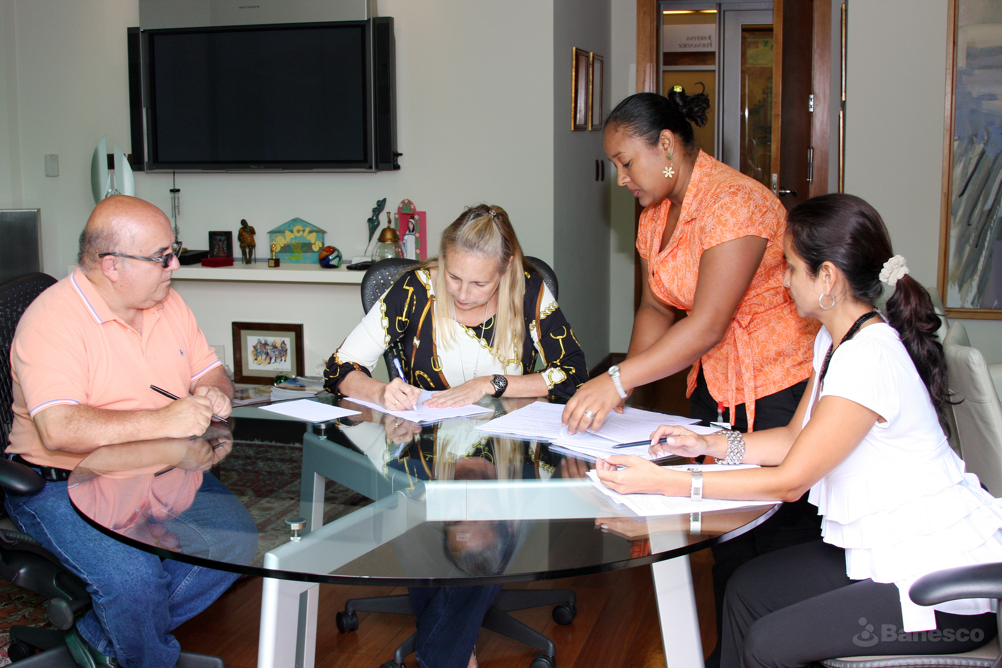 Josefina Fernández, representante de Banesco firmando el documento junto a Luis Germán Prato para la renovación del convenio entre La Asociación Civil Red de Casas Don Bosco y la institución financiera.