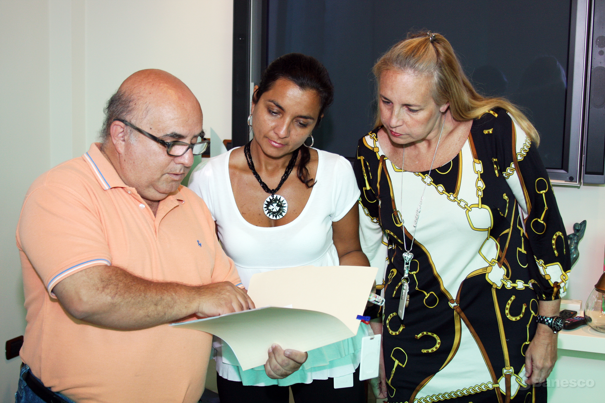 Luis Germán Prato, representante de La Asociación Civil Red de Casas Don Bosco, lee detenidamente el documento firmado junto a las representantes de Banesco Iride Rivera y Josefina Fernández.