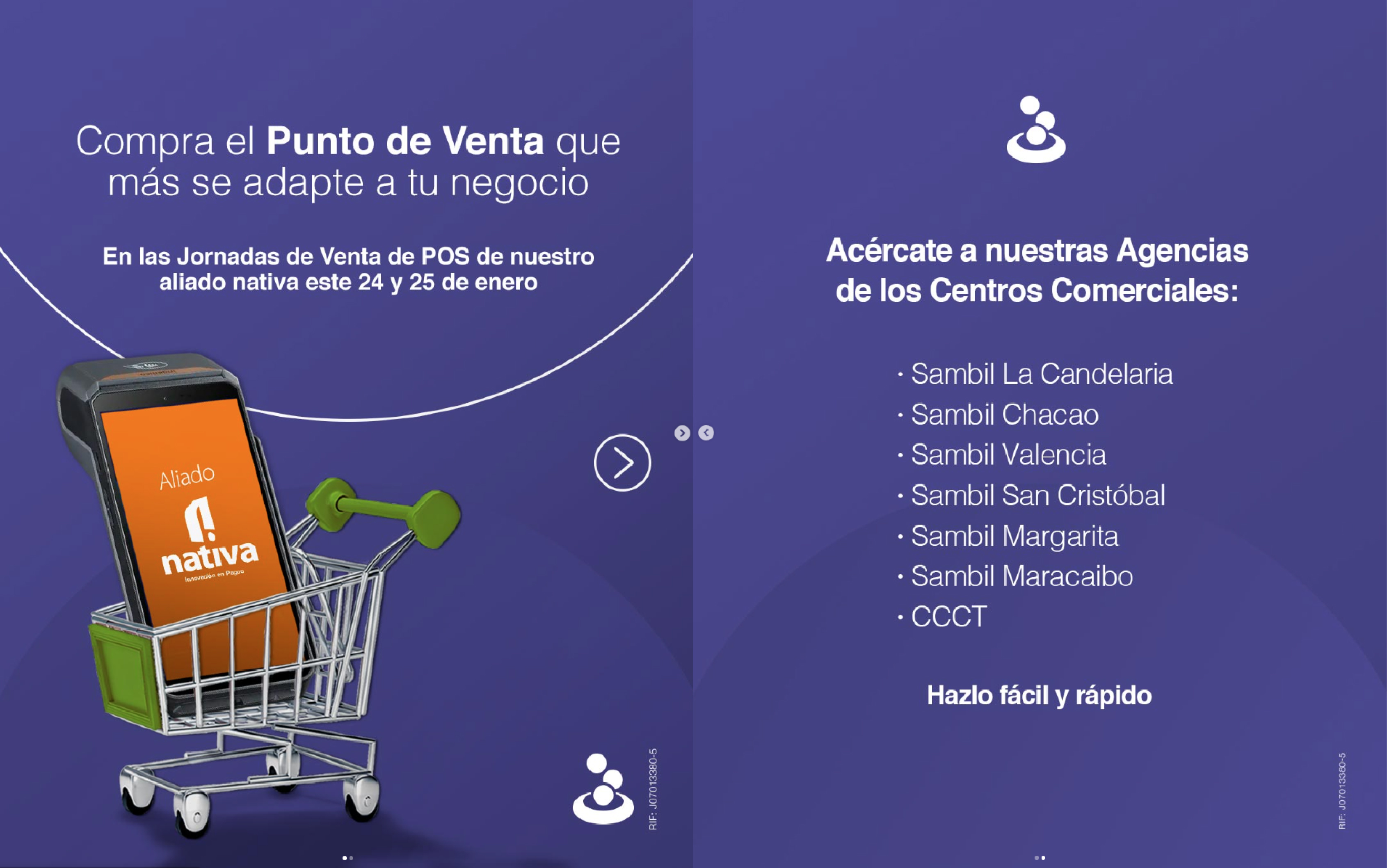 Junto al aliado @nativapagos, te esperamos el viernes 24 y sábado 25 de enero en nuestras agencias Banesco de los siguientes centros comerciales: Sambil La Candelaria, Sambil Chacao, Sambil Valencia, Sambil San Cristóbal, Sambil Maracaibo, Sambil Margarita y CCCT.