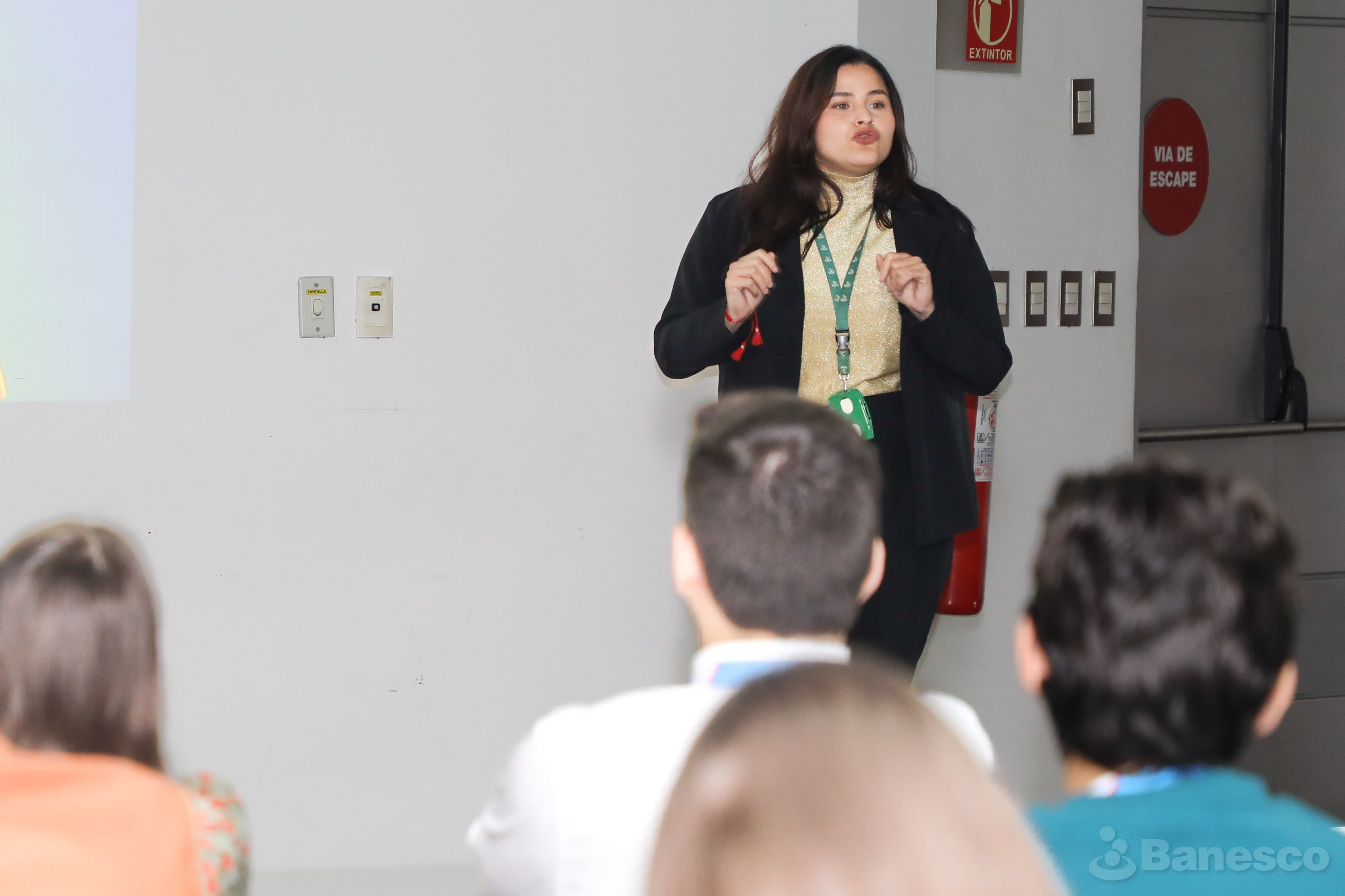 Waleska López Villafranca, expone el tema de Inteligencia Artificial en la charla ofrecida a los estudiantes de la Universidad Católica Andrés Bello y de la Universidad Metropolitana de Caracas durante la visita realizada a las instalaciones de Ciudad Banesco.
