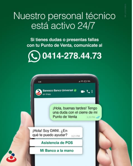 Guarda este número y escríbenos al (0414) 278.4473 para que recibas soporte a través de WhatsApp, nuestros técnicos especializados están disponibles 24/7 para responder tus preguntas, brindarte la mejor atención y la asistencia que necesitas. Recuerda, si es fácil y rápido, es Banesco.