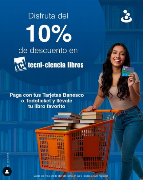 En ocasión del Día Mundial del Libro este próximo 23 de abril, nos aliamos con @tecni_ciencia para ofrecerte 10% de descuento en todas tus compras de libros al pagar con tus Tarjetas Banesco (Débito y Crédito) o @todoticketvzla.