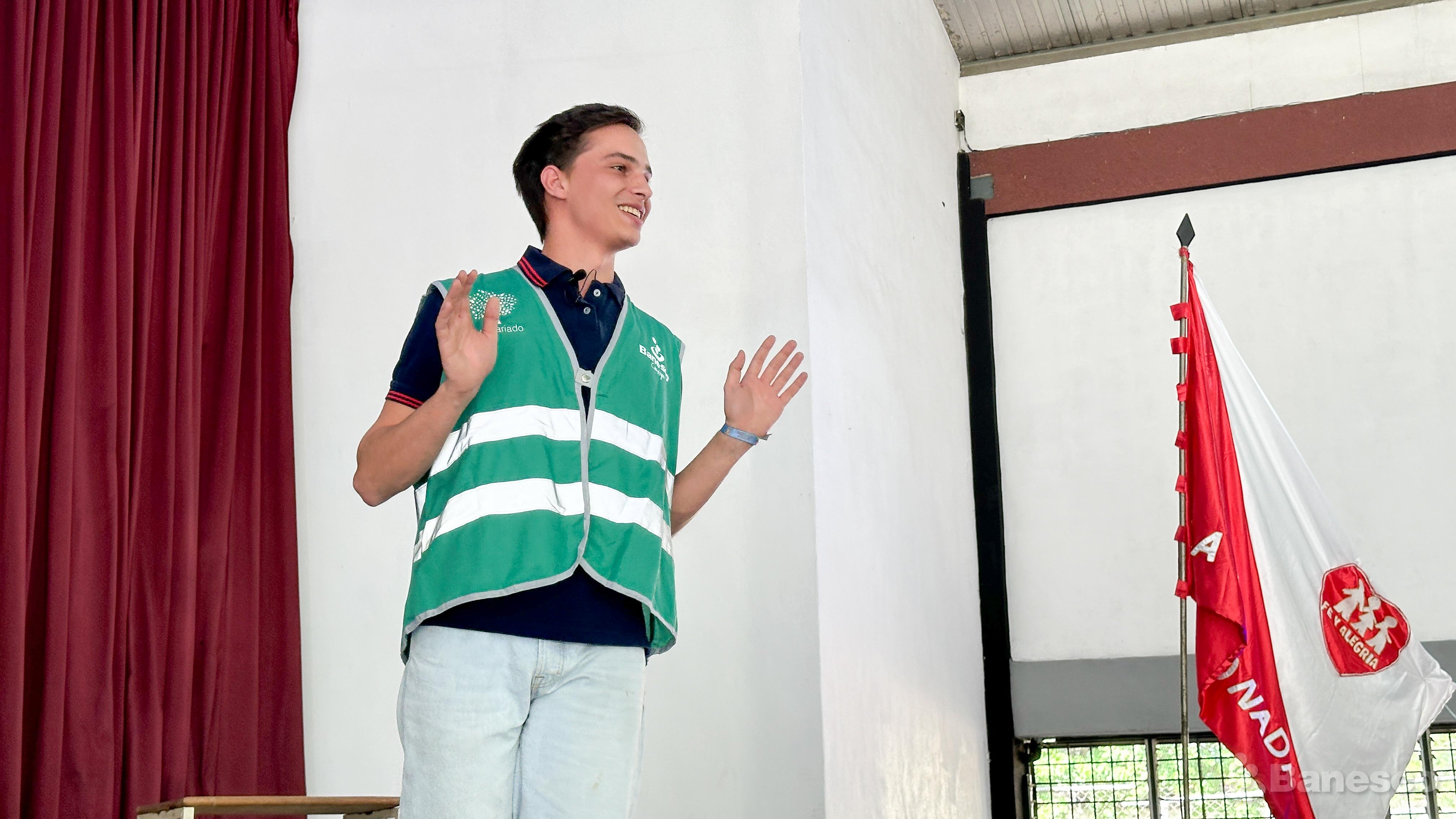 El Voluntario Banesco Michell Alexander Blanco, dando una charla titulada "Hablemos del Bullying y las Redes Sociales", para dar herramientas sobre la importancia en la prevención del bullying y del uso correcto de las Redes Sociales a más de 800 estudiantes de la Escuela Técnica Fe y Alegría de La Rinconada.