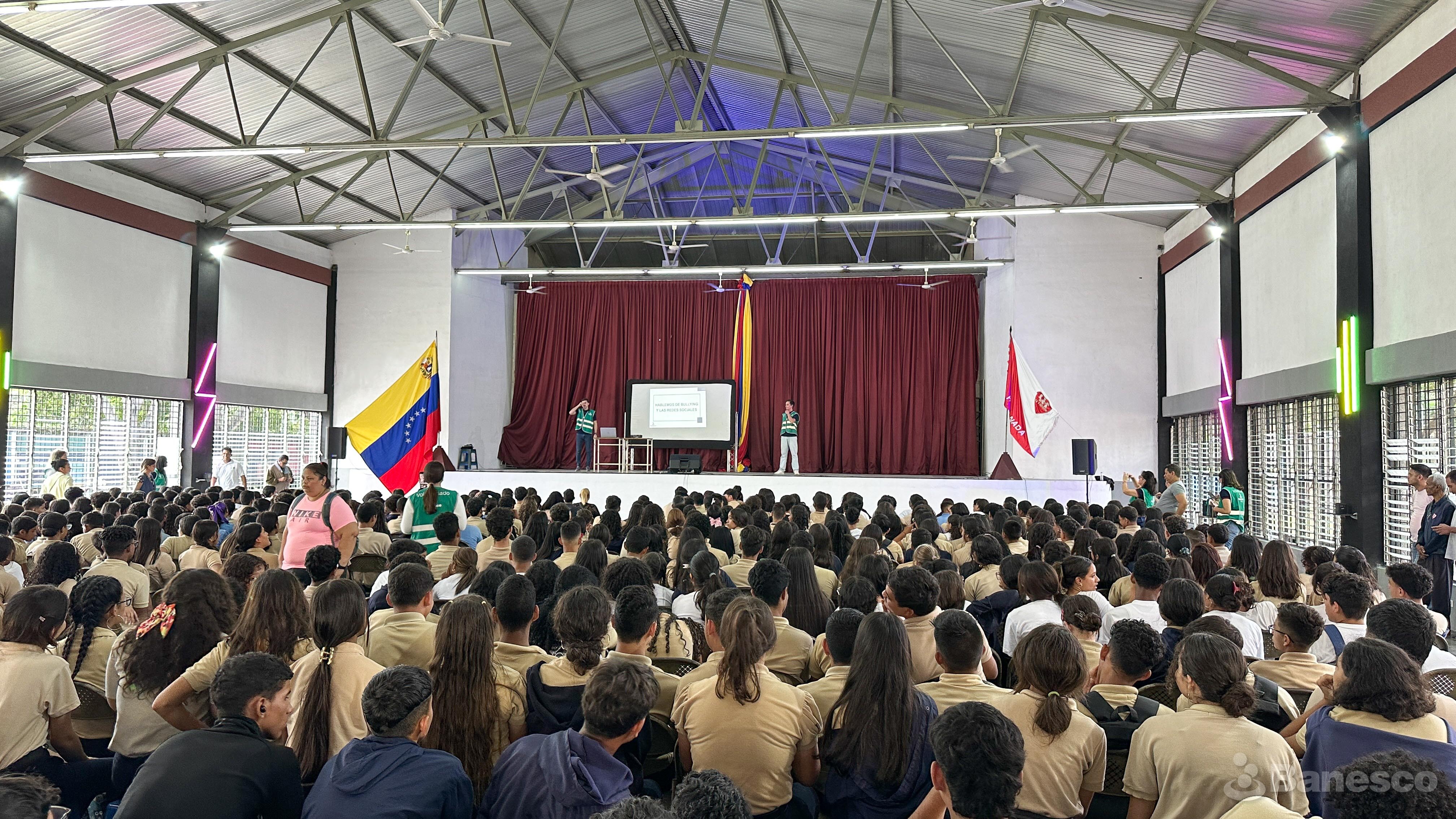 Francesco Donnarumma junto a Michell Blanco durante la charla "Hablemos de Bullying y las Redes Sociales", realizada en el colegio de Fe y Alegría de La Rinconada, en la que asistieron aproximadamente 800 niños y adoslescentes.