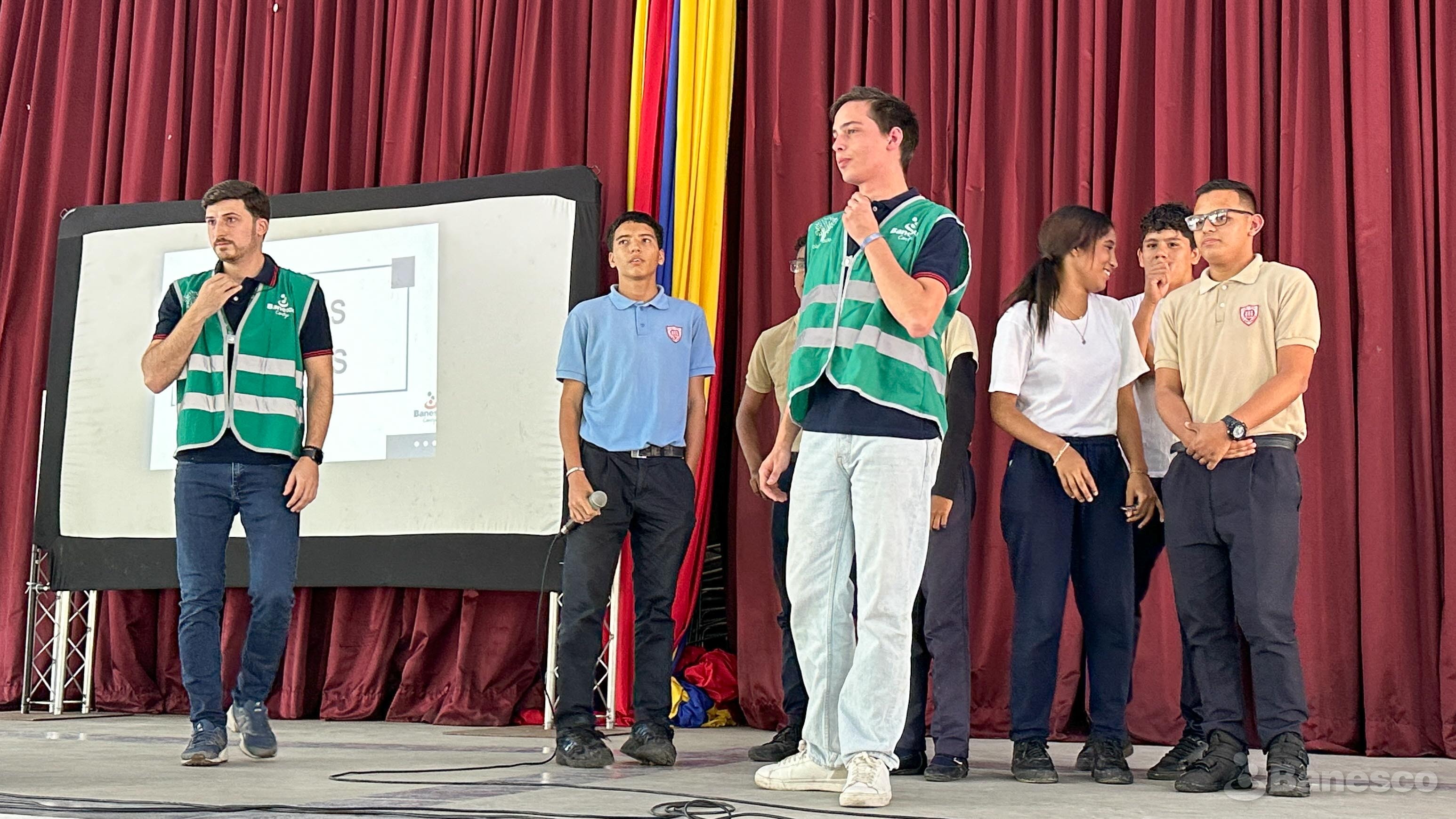 Voluntarios Banesco junto a estudiantes de la Escuela Técnica Fe y Alegría de La Rinconada compartiendo posterior a la charla titulada "Hablemos del Bullying y las Redes Sociales".
