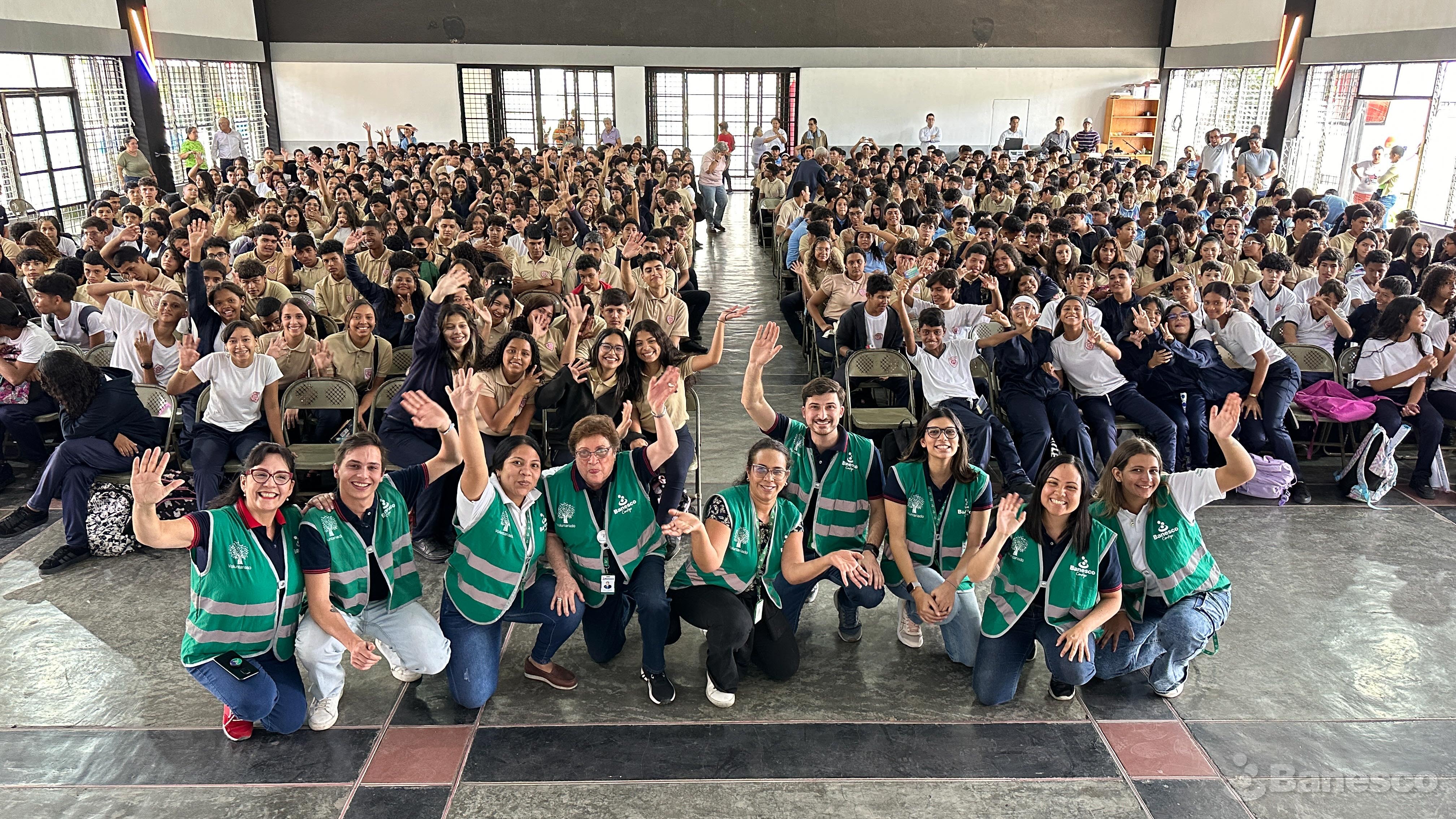 Yajaira Arraiz, Michell Blanco, Judith Borges, Fanny Leiva, Francesco Donnarumma, Dubraska Lanza y Bárbara Gónzalez al finalizar la jornada realizada por el Voluntariado Banesco durante la visita a la Escuela Técnica Fe y Alegría La Rinconada llevada a cabo en el marco del programa de Responsabilidad Social Empresarial de la institución, para concientizar sobre la importancia en la prevención del bullying y el correcto uso de las Redes Sociales.