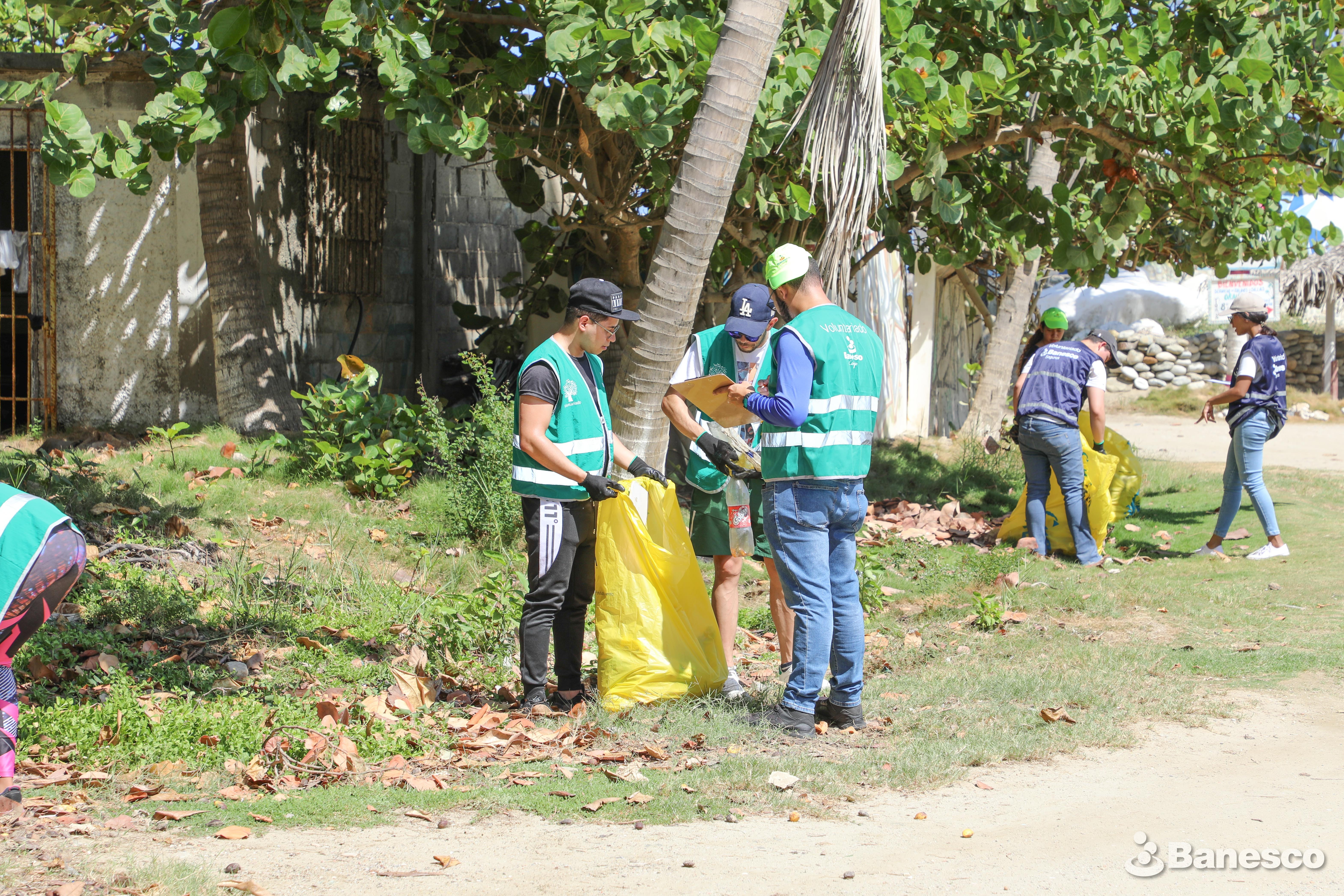 Colaboradores Banesco recogiendo desechos en la 2da. jornada de limpieza de playas, en el marco del programa de Responsabilidad Social Empresarial que lleva a cabo la institución bancaria.