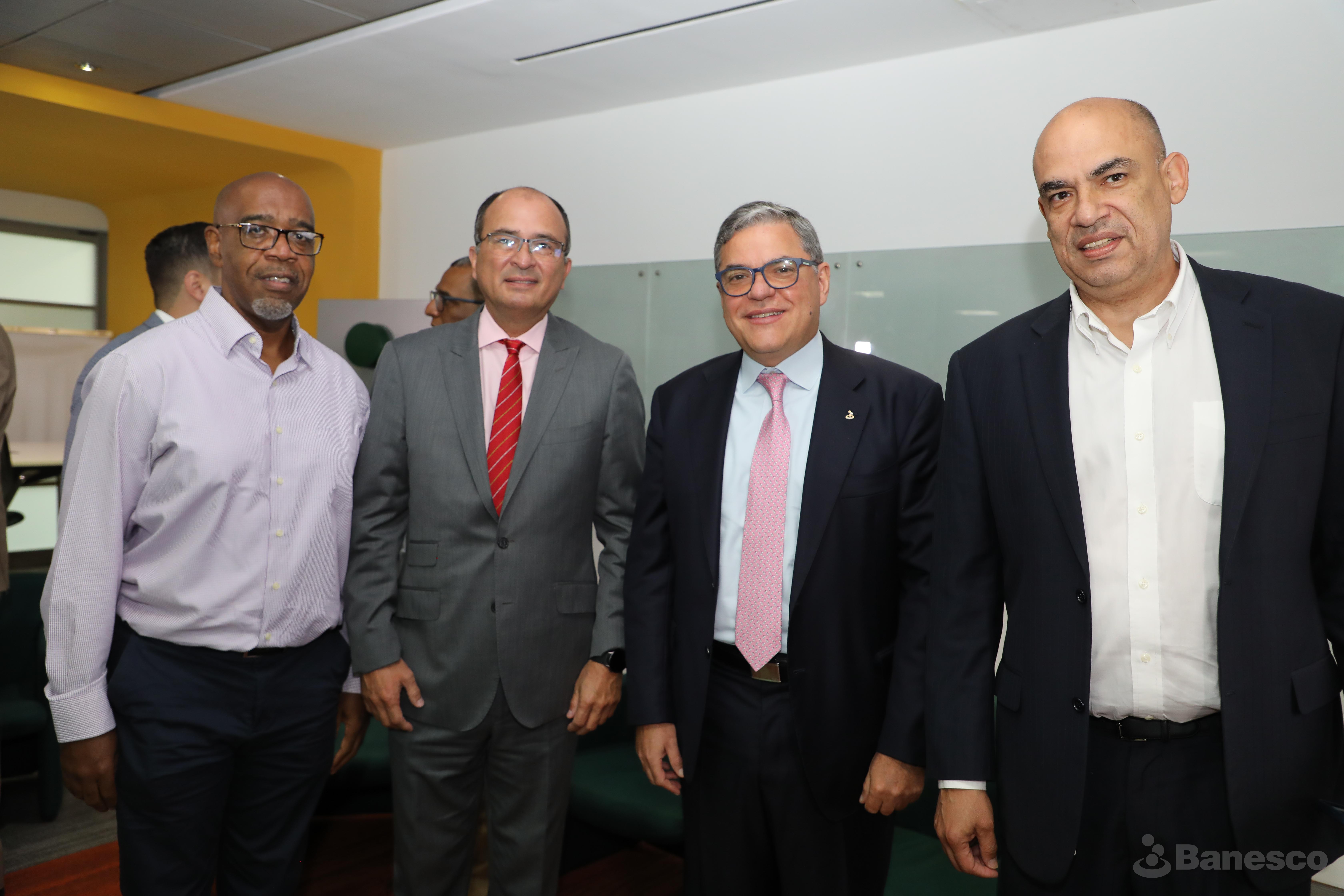 Nelson “Kako” Solórzano, figura destacada del baloncesto nacional, Juan Carlos Cuenca, vicepresidente de la Superliga Profesional de Baloncesto, Marco Ortega, presidente de la Junta Directiva de Banesco y Jesús Irausquín, Vp. de Seguridad Integral en el bautizo del libro "Bajo el Aro", realizado en las instalaciones de Ciudad Banesco.