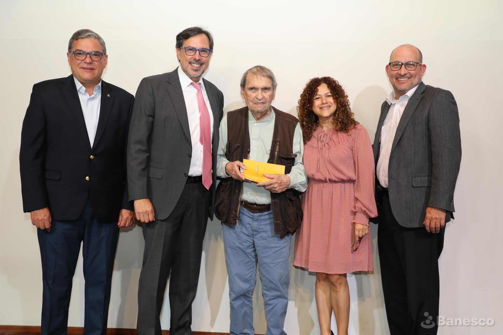 Marco Ortega, presidente de la Junta Directiva Banesco, Marlo Ovalles, presidente de la Poeteca, Rafael Cadenas, poeta venezolano, Tibisay Guerra, directora de Autores Venezolanos y Carlos Millán, presidente ejecutivo de Banesco, al momento del bautizo del libro de la "9° Antología del Concurso Nacional de Poesía Joven Rafael Cadenas".