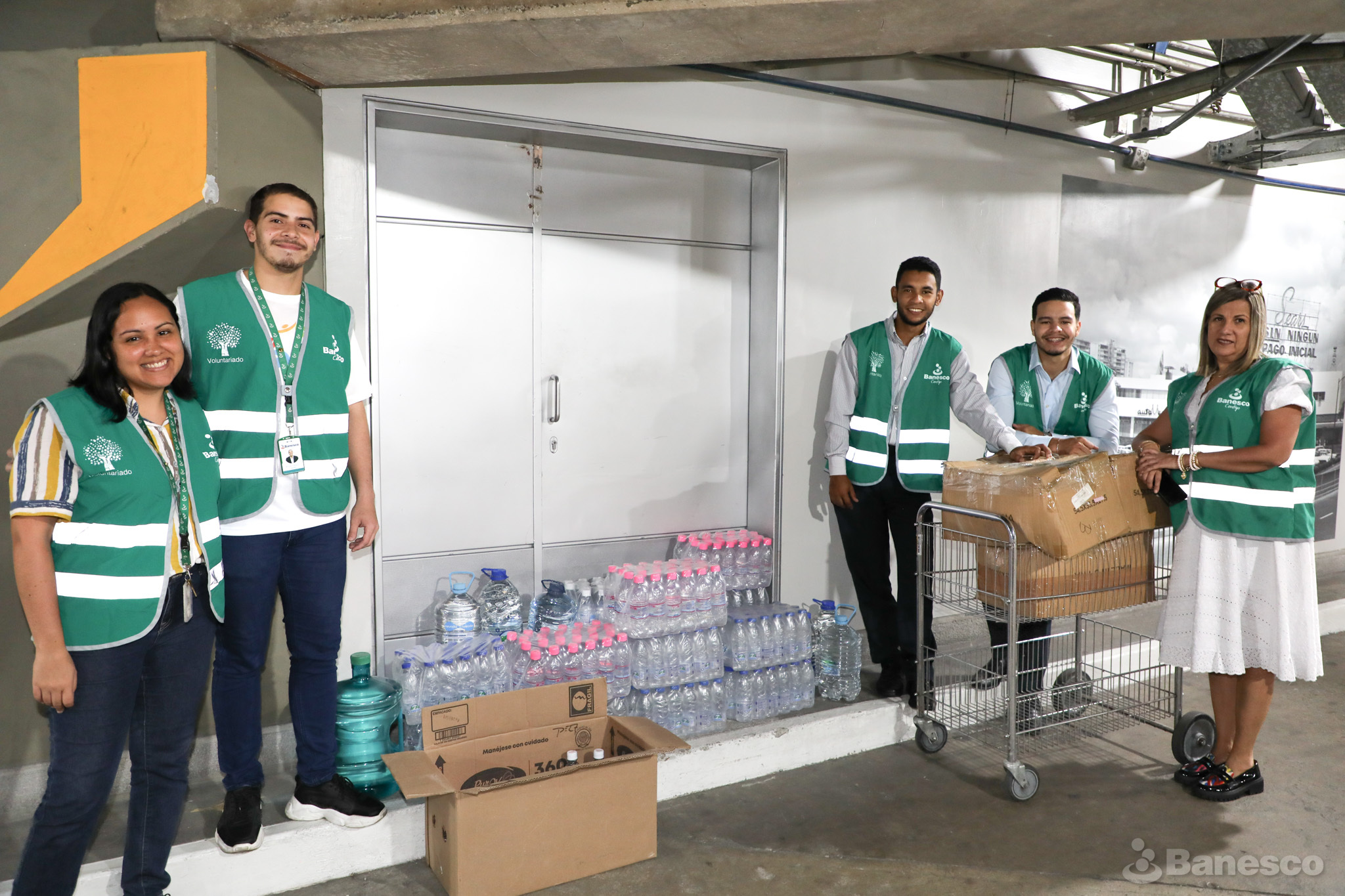 Voluntariado Banesco organizando los donativos de agua y comida que se entregarán a las familias de Cumanacoa, como parte del compromiso que tiene la institución bancaria con el país y con las familias afectadas por las fuertes lluvias acontecidas en el mes de julio.