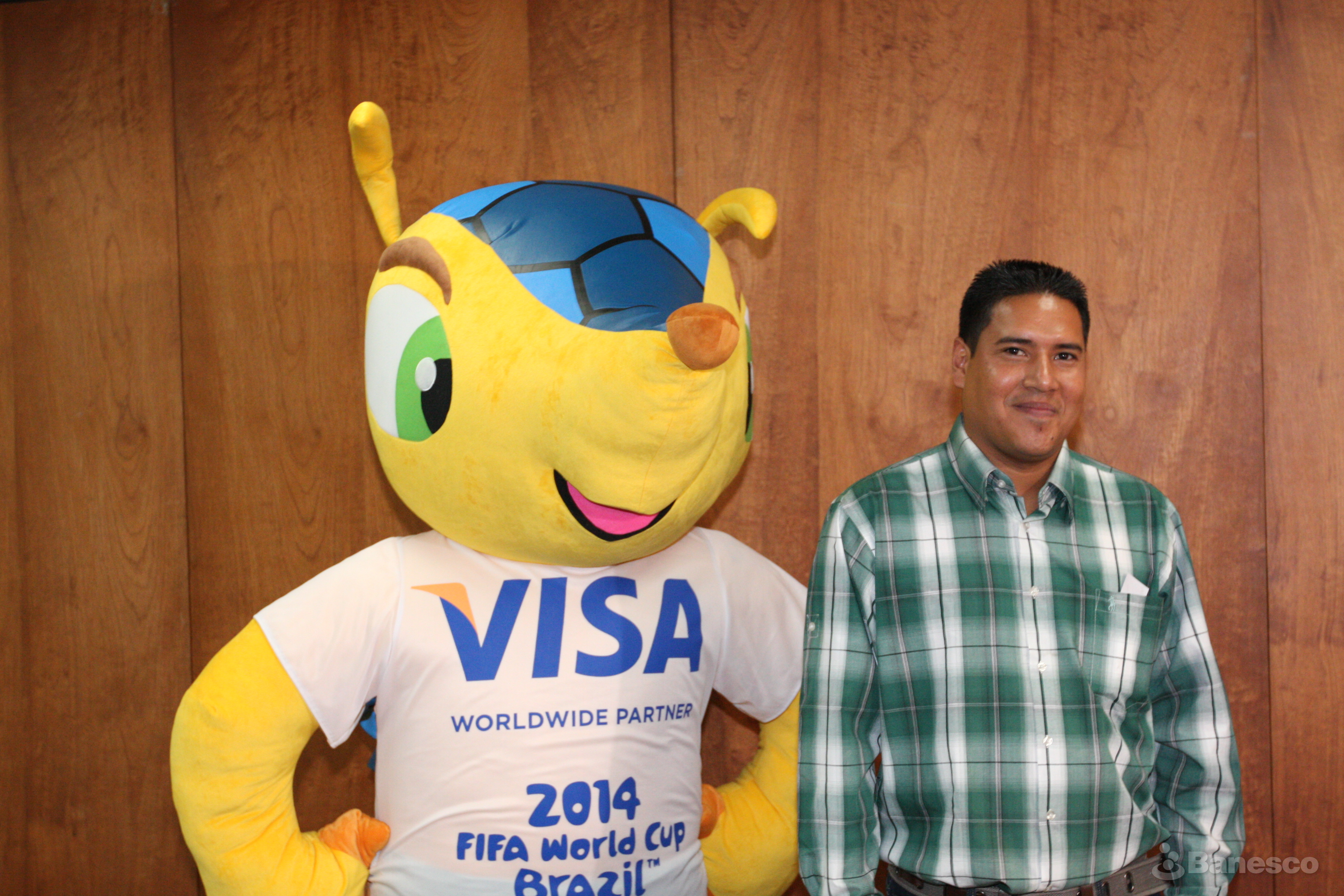 Ganador de la promoción Banesco Copa Mundial FIFA Brasil 2014 cortesía de VISA, junto a Fuleco, mascota oficial del mundial.