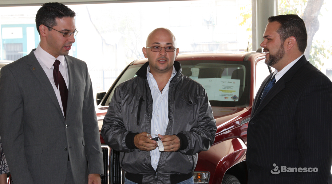 Heber Leandro de Banesco, Evelio González y Enio Aldazoro de Banesco, en la entrega de premios de la Promoción “Tu suerte está en camino”, realizada junto a MasterCard.
