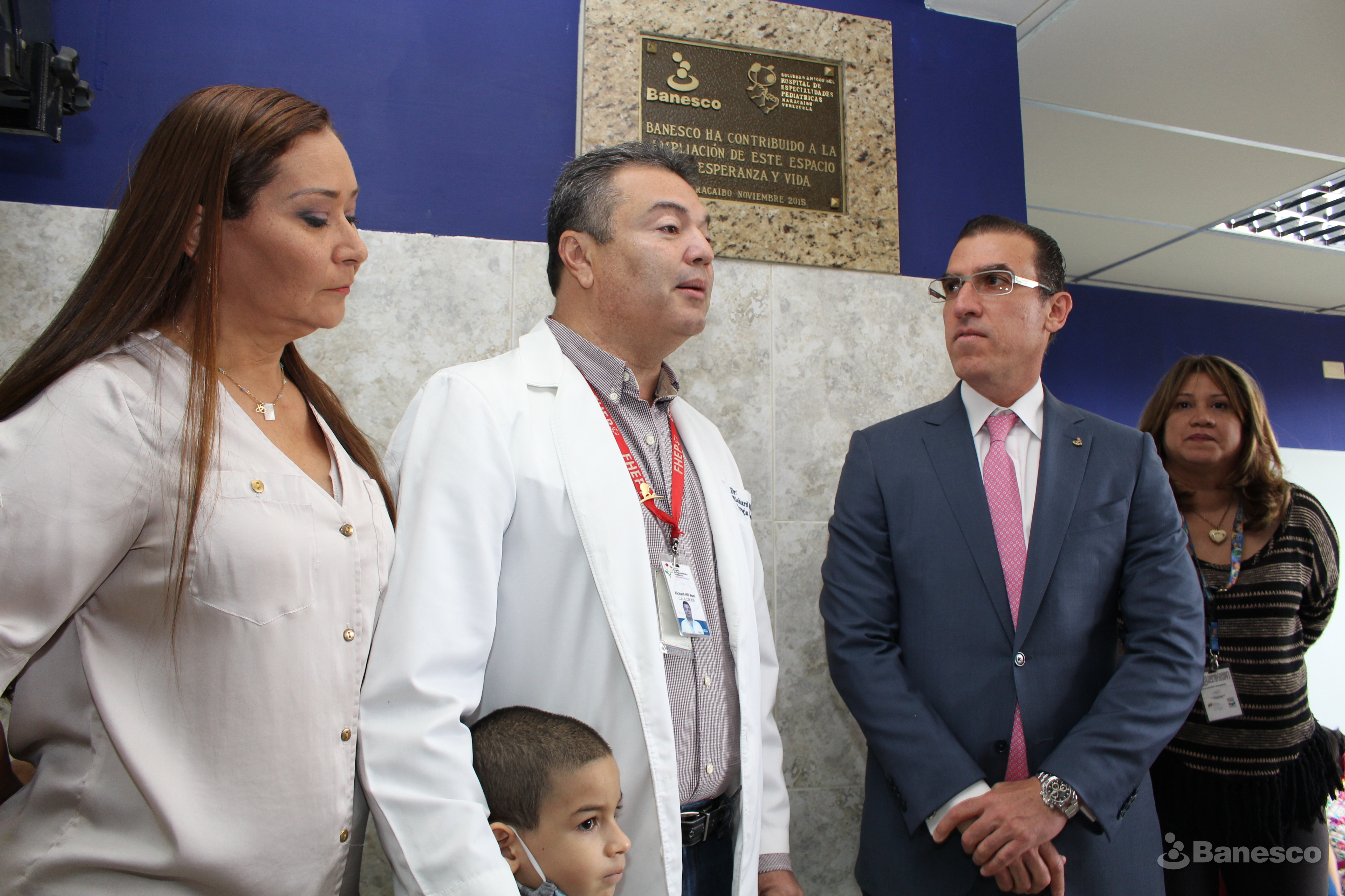 Personal del Hospital Universitario de Maracaibo en el Estado Zulia junto a Miguel Ángel Marcano, presidente ejecutivo de Banesco durante la revelación de la placa a nombre de la institución bancaria por haber contribuido con 2 millones de bolívares para la ampliación de la sala de espera de la unidad de oncología.