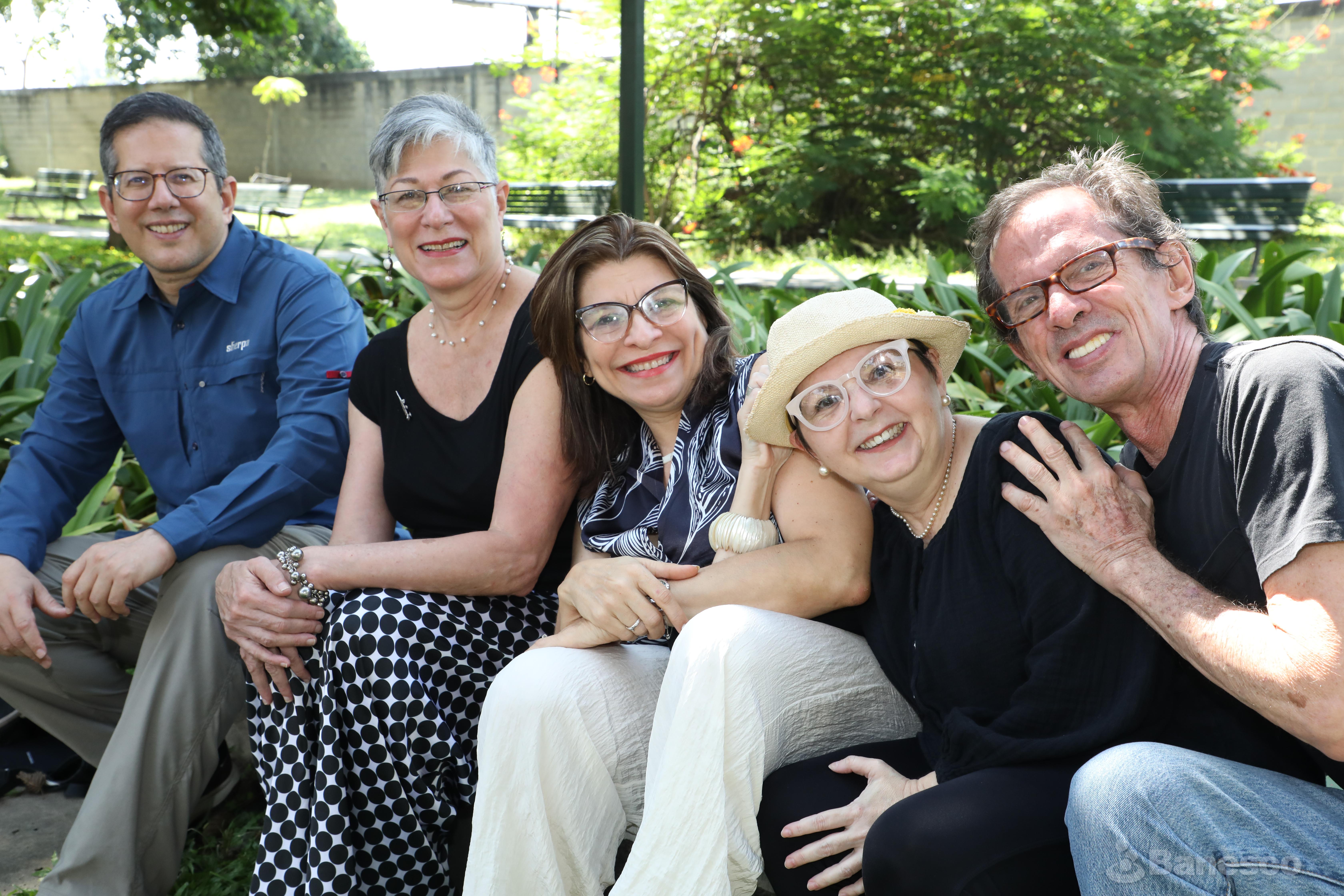 Fanuel Hanan Díaz, compilador; Waleska Belisario, diseñadora; Alicia Montero, compiladora; Jacqueline Goldberg, coordinadora editorial; y Antonio Marcano, ilustrador; se reúnen en el Parque Aruflo para grabar la presentación del libro "Poemas en bicicleta. Antología de poesía venezolana".