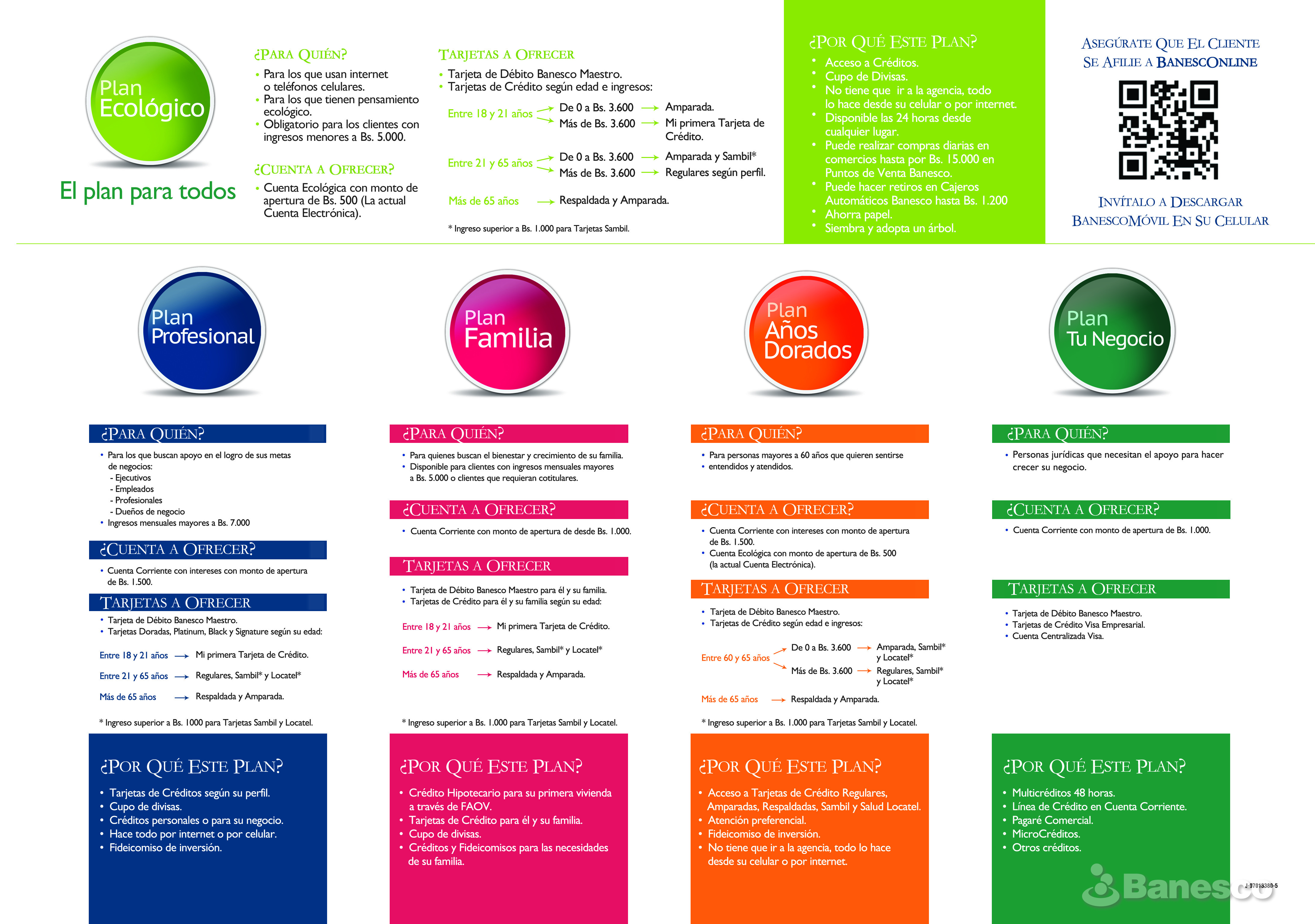 Planes Contigo Banesco te ofrece Plan Ecológico, Plan Profesional, Plan Familia y Plan Años Dorados.