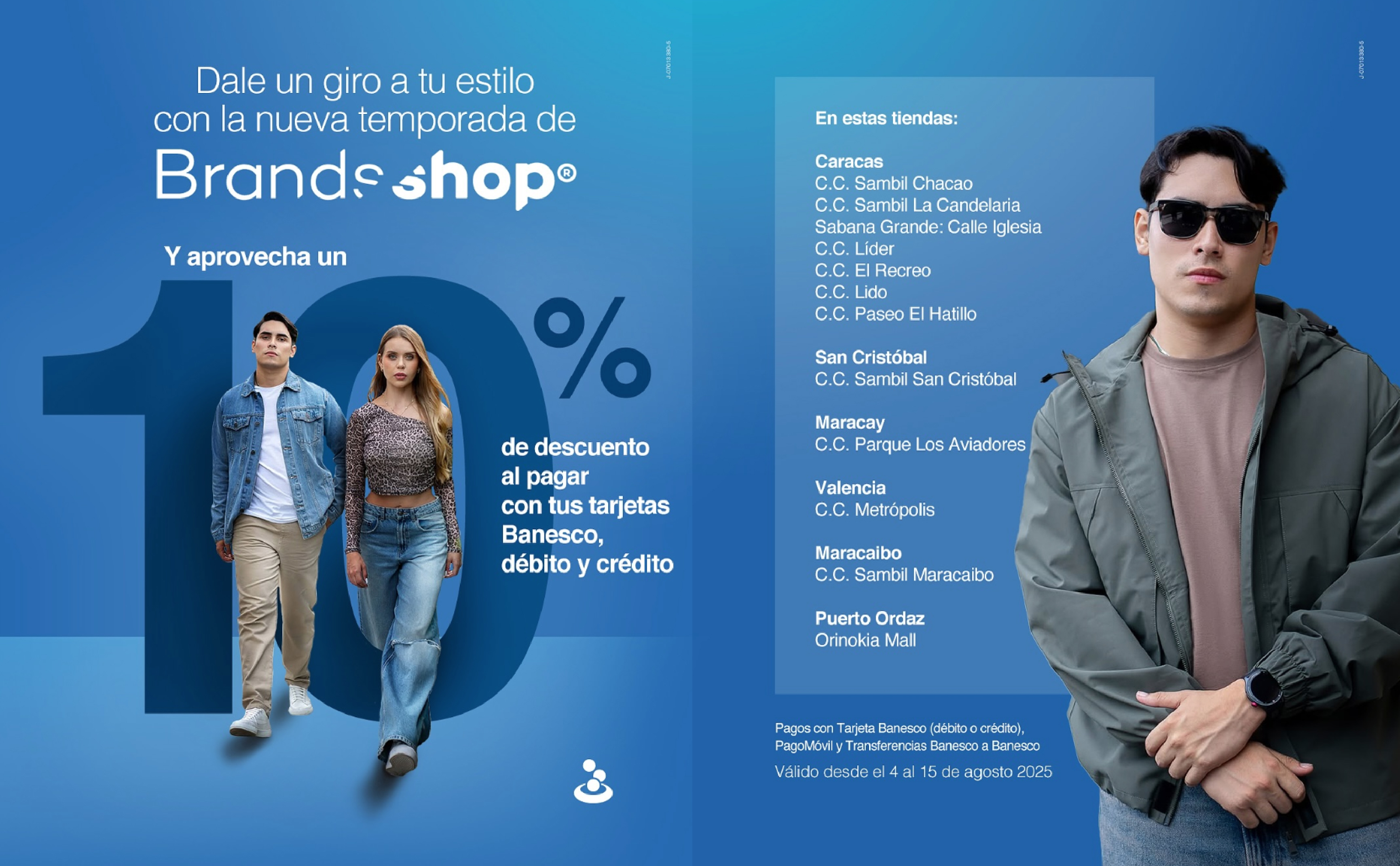 Descuento válido desde el 4 al 15 de agosto 2025, al pagar con tus tarjetas Banesco en todas las tiendas Brands Shop a nivel nacional: Caracas, Maracay, Valencia, San Cristóbal, Maracaibo y Puerto Ordaz.