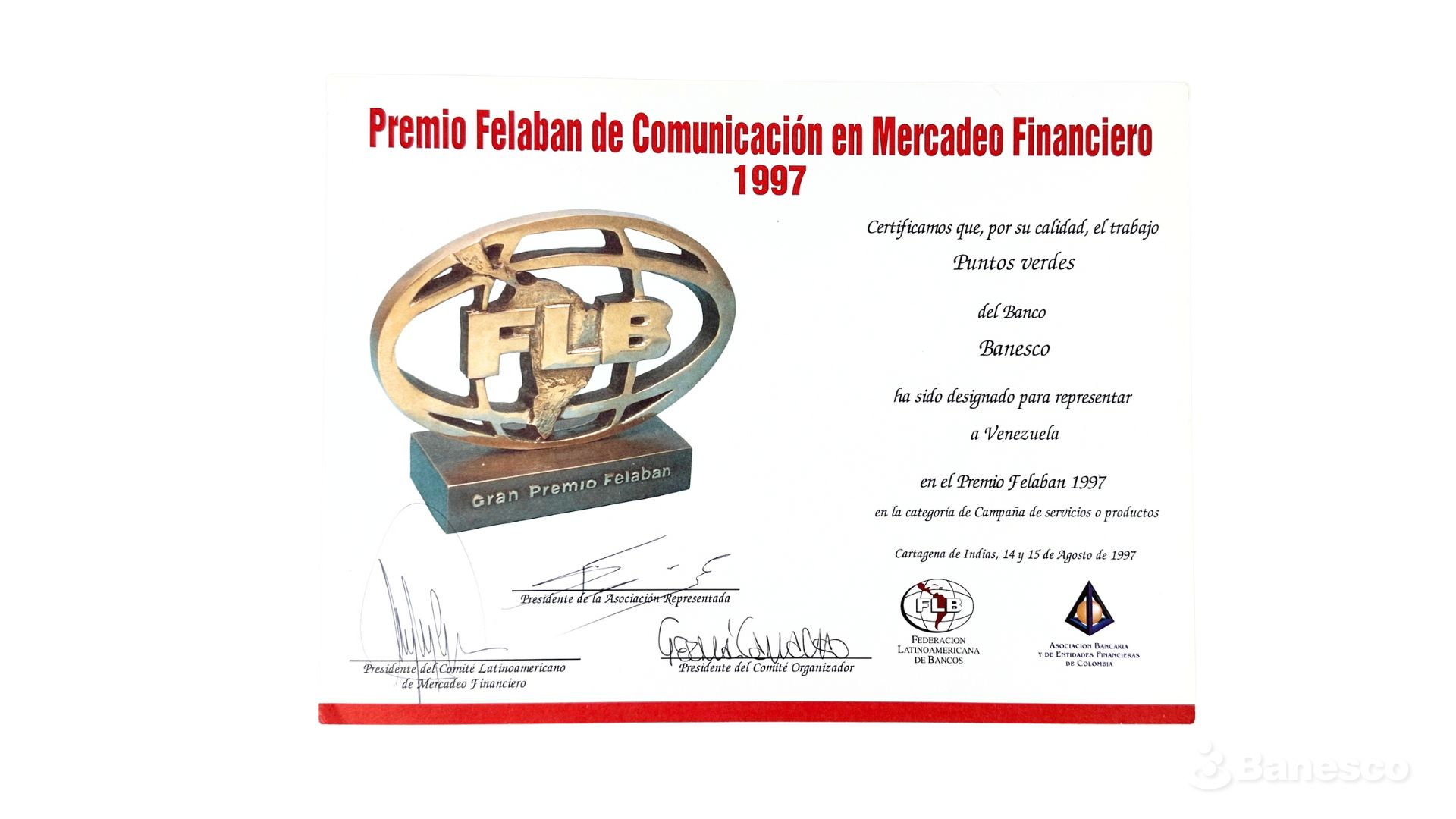 Banesco recibe el premio Felaban de "Comunicación y Mercadeo Financiero 1997" por el trabajo "Puntos verdes", ha sido designado para representar a Venezuela en la categoría de campaña de servicios o productos.