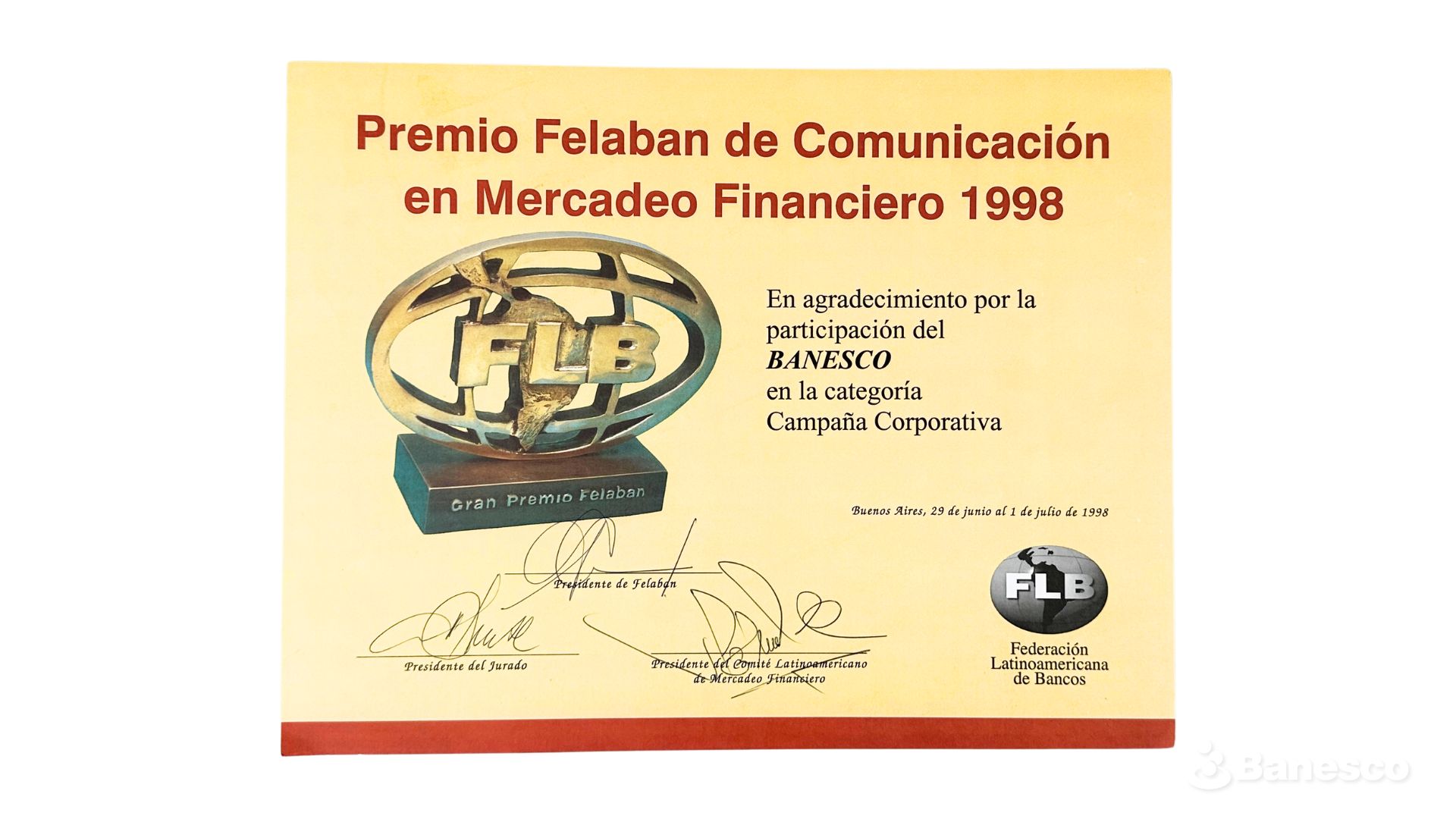 Banesco recibe el premio Felaban de "Comunicación y Mercadeo Financiero 1998" en agradecimiento por su participación en la categoría de campaña corporativa.