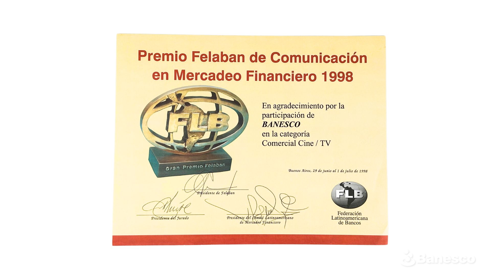 Banesco recibe el premio Felaban de "Comunicación y Mercadeo Financiero 1998" en agradecimiento por su participación en la categoría de Comercial Cine / Tv.