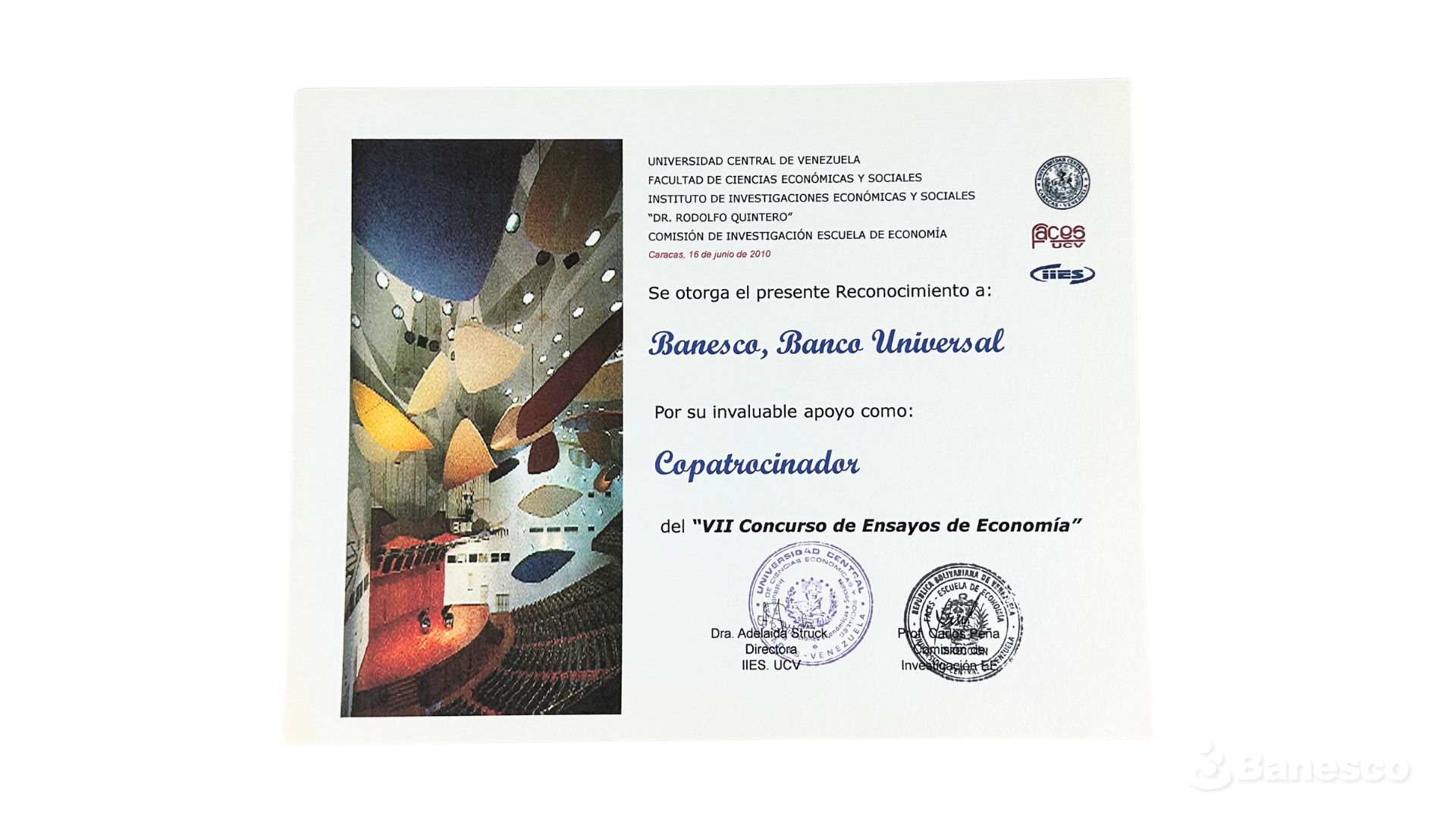 La Universidad Central de Venezuela le otorga el reconocimiento a Banesco por su invaluable apoyo como copatrocinador del "VII Concurso de Ensayos de Economía".