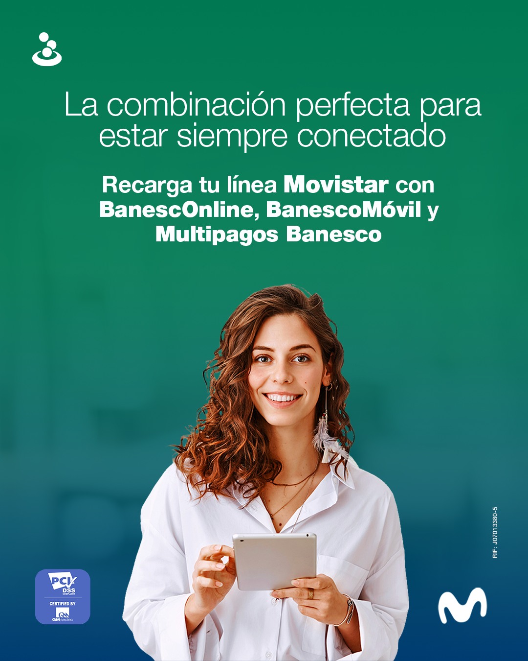Recarga tu línea @movistarve de forma ágil y segura con Banesco a través de: BanescOnline, BanescoMóvil, MultipagosBanesco. ¡Tu conexión, tu mundo!.