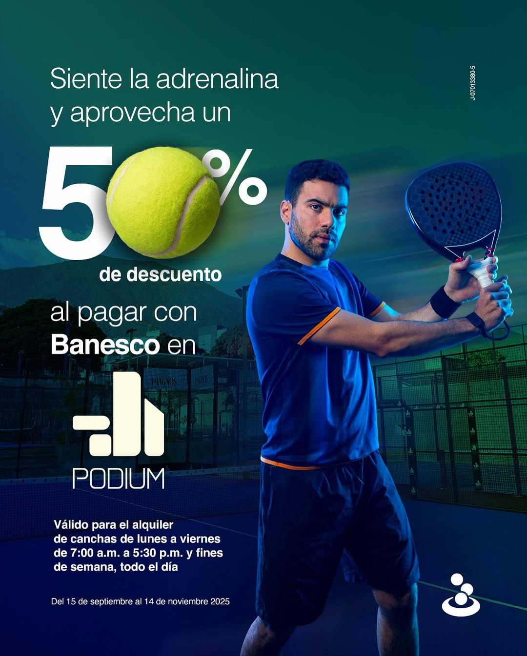 Disfruta de un increíble 50% de descuento al pagar con Banesco en @podium.padel. Reúne a tus panas y vive la adrenalina de darlo todo en la cancha mientras tienes la mejor experiencia de pádel.
