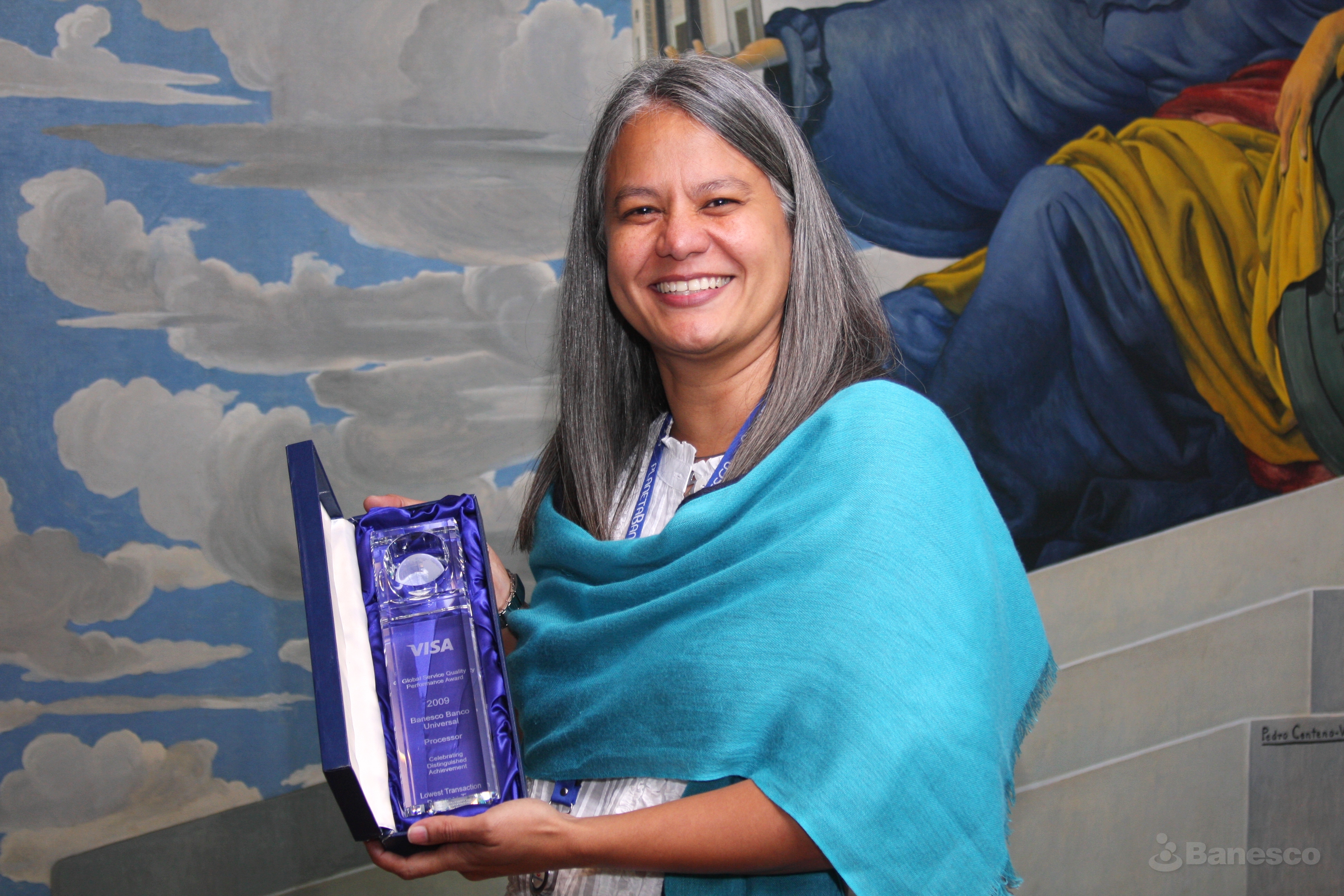 Colaboradora Banesco sosteniendo premio otorgado por Visa