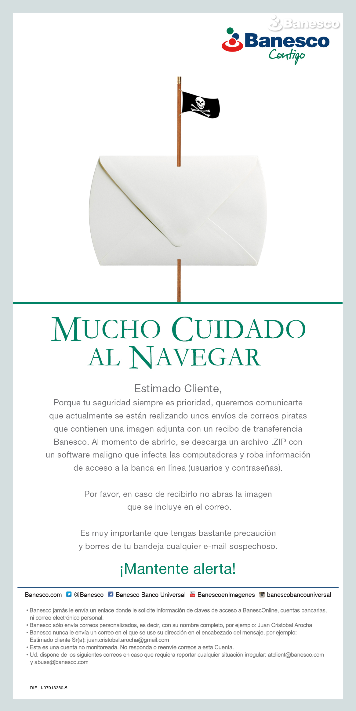Porque tu seguridad siempre es prioridad, queremos comunicarte que actualmente se están realizando unos envíos de correos piratas que contienen una imagen adjunta con un recibo de transferencia Banesco.