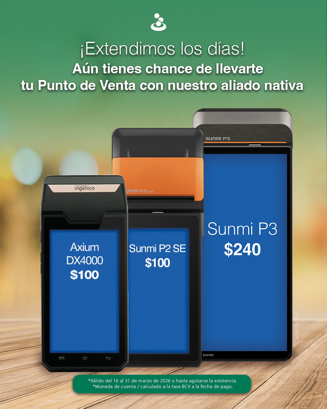 Sabemos lo importante que es para ti ofrecer la mejor experiencia a tus clientes. Por eso, hemos extendido el plazo para que adquieras tu Punto de Venta a un precio especial. Es el momento ideal para brindarles más opciones de pago ¡y tú veas crecer tu negocio!. El aliado @nativapagos te trae los mejores equipos: