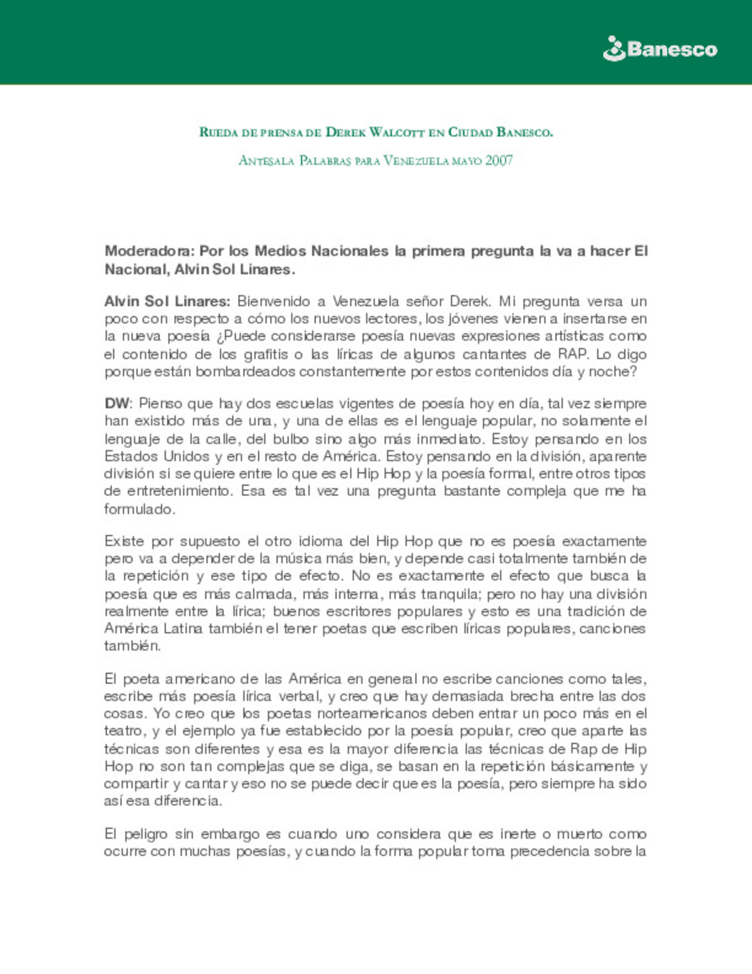 Rueda de prensa de Derek Walcott en Ciudad Banesco
