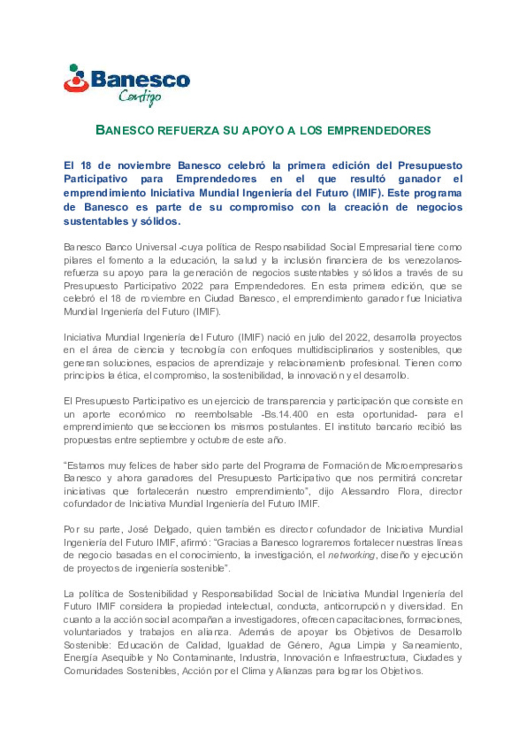 Consideramos que la actividad económica debe ser inclusiva y proveer de oportunidades a todas las comunidades donde operamos. Por eso Banesco contribuye activamente a desarrollar el Objetivo de Desarrollo Sostenible de Naciones Unidas número diez: ‘Reducción de las Desigualdades’, entre otras formas, a través del impulso de la formación para el emprendimiento y la innovación y la orientación para contribuir a incorporar los microempresarios y emprendedores a la economía formal.