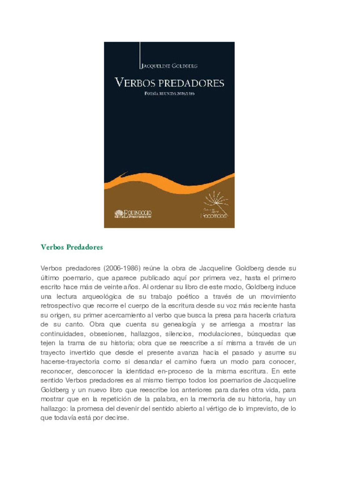 Verbos predadores (2006-1986) reúne la obra de Jacqueline Goldberg desde su último poemario, que aparece publicado aquí por primera vez, hasta el primero escrito hace más de veinte años. Al ordenar su libro de este modo, Goldberg induce una lectura arqueológica de su trabajo poético a través de un movimiento retrospectivo que recorre el cuerpo de la escritura desde su voz más reciente hasta su origen, su primer acercamiento al verbo que busca la presa para hacerla criatura de su canto. Obra que cuenta su genealogía y se arriesga a mostrar las continuidades, obsesiones, hallazgos, silencios, modulaciones, búsquedas que tejen la trama de su historia; obra que se reescribe a sí misma a través de un trayecto invertido que desde el presente avanza hacia el pasado y asume su hacerse-trayectoria como si desandar el camino fuera un modo para conocer, reconocer, desconocer la identidad en-proceso de la misma escritura. En este sentido Verbos predadores es al mismo tiempo todos los poemarios de Jacqueline Goldberg y un nuevo libro que reescribe los anteriores para darles otra vida, para mostrar que en la repetición de la palabra, en la memoria de su historia, hay un hallazgo: la promesa del devenir del sentido abierto al vértigo de lo imprevisto, de lo que todavía está por decirse. Gina Saraceni
