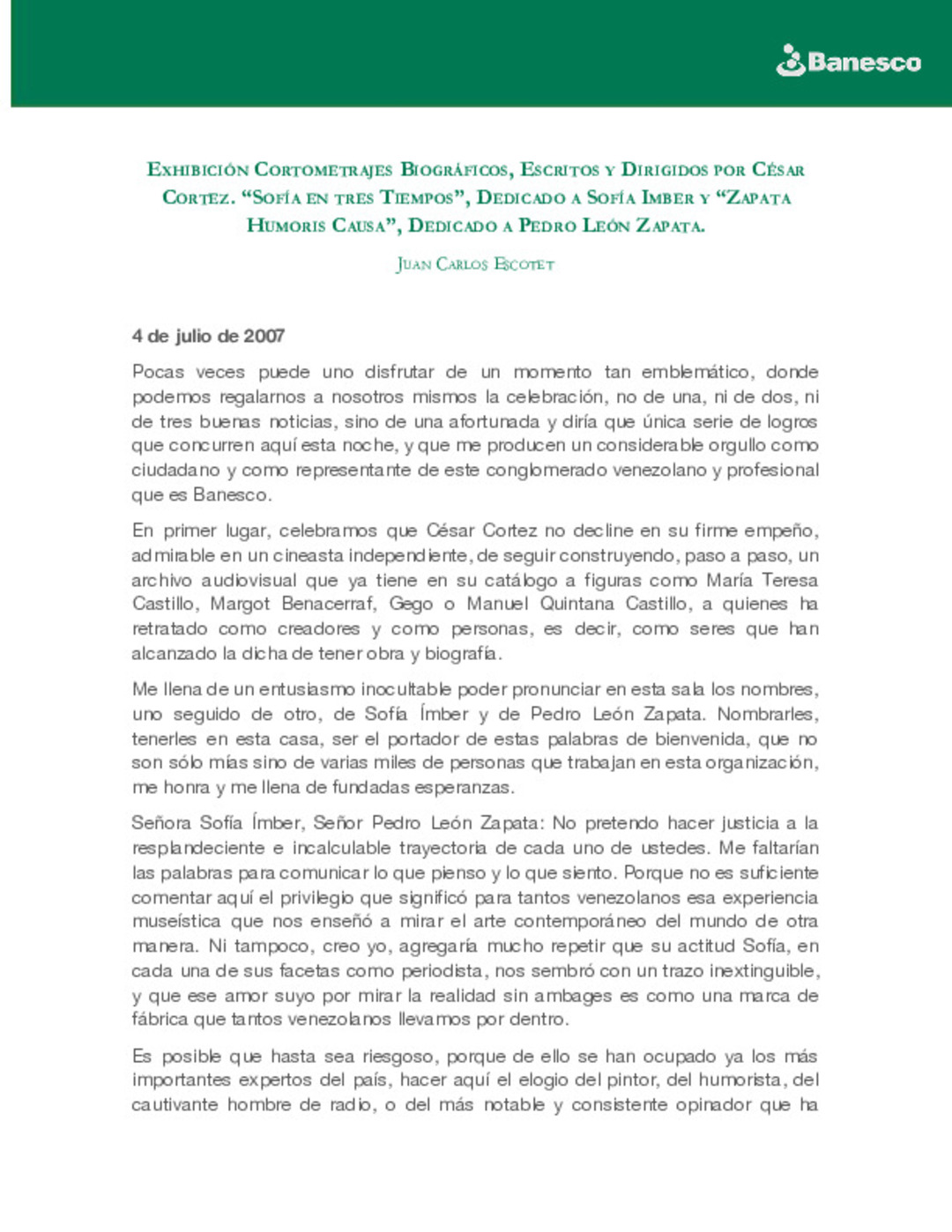 Palabras de Juan Carlos Escotet durante la proyección de "Sofía en Tres Tiempos" y "Zapata Humoris Causa"