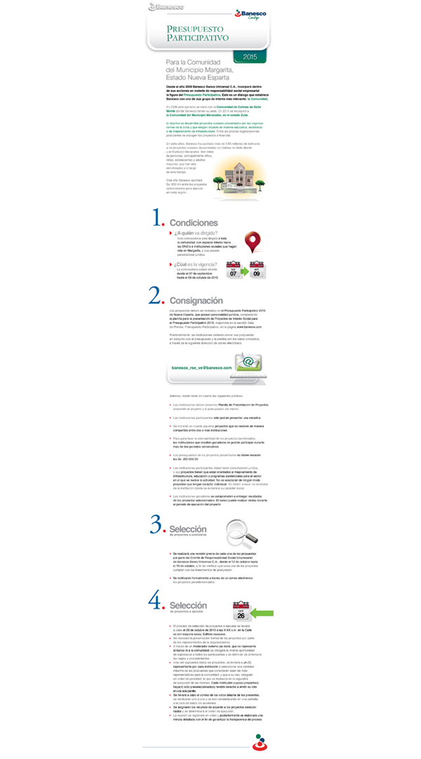 Convoca a postular tu proyecto de corte educativo, cultural, de salud o de infraestructura a beneficio de la comunidad en el Presupuesto Participativo con el Municipio Baruta. Además, indica los pasos y el tiempo de postulación y consignación de las propuestas, donde serán seleccionados y notificados los proyectos que cumplan con los lineamientos antes mencionados.