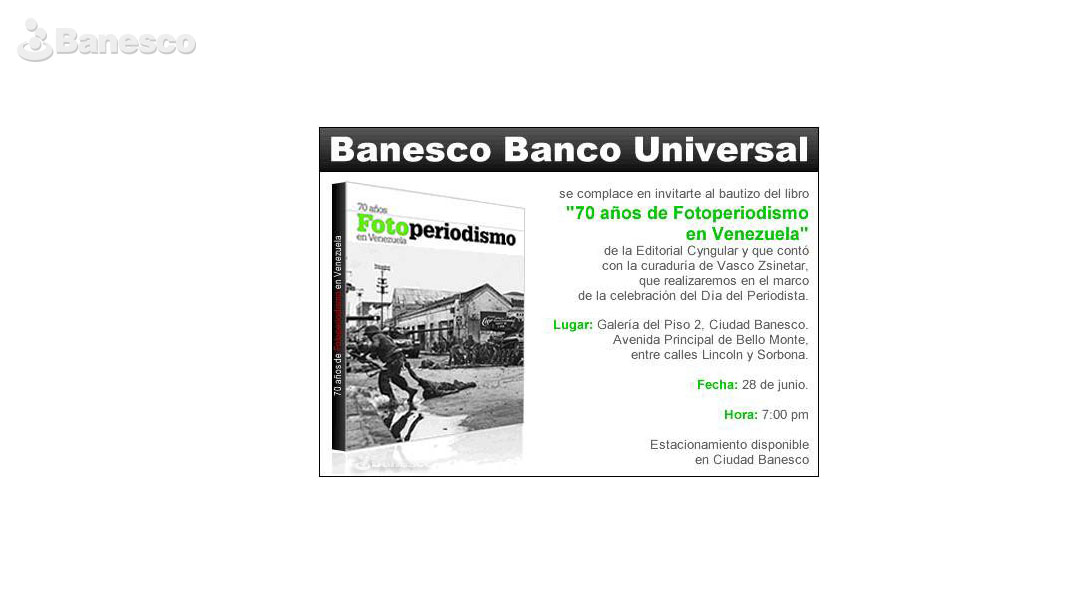 Invitación a la celebración del bautizo del libro 70 años de Fotoperiodismo en Venezuela de la editorial Cyngular.