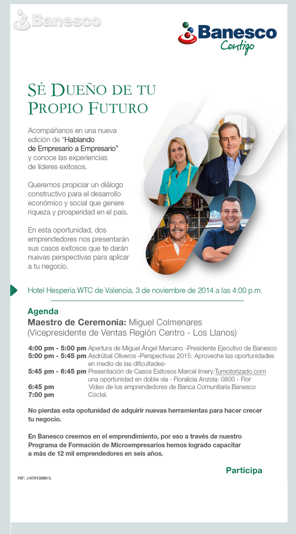 Invitación a una nueva edición de "Hablando de Empresario a Empresario", donde se conocerán las experiencias de líderes exitosos. Evento realizado en el Hotel Hesperia WTC de Valencia