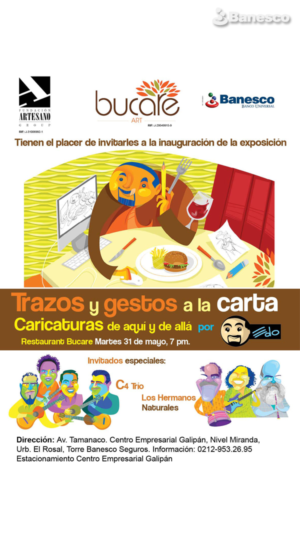 Invita a la inauguración de la exposición de Trazos y Gestos a la Carta. Caricaturas de aquí y de allá. Con invitados especiales C4Trío y Los Hermanos Naturales