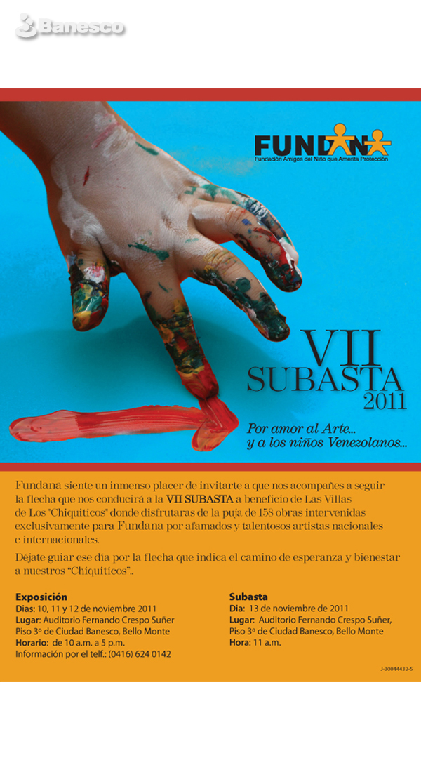 Invitación a la VII Subasta a beneficio de Las Villas de Los ''Chiquiticos'' donde disfrutarás obras intervenidas exclusivamente por Fundana por talentosos artistas nacionales e internacionales.