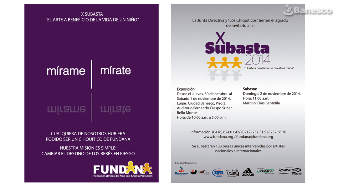 Junta Directiva y ''Los Chiquiticos'' invitan a la X Subasta 2014 donde se expondrán y subastarán 113 piezas de artistas nacionales e internacionales. Fundana tiene como misión Cambiar el destino de los bebés en riesgo.