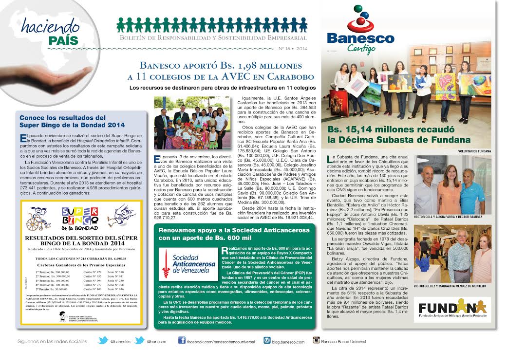 Banesco aporto Bs. 1.98 millones a 11 colegios de la AVEC en Carabobo, Resultados del Súper Bingo de la Bondad, Se recaudo B5,14 millones en la Décima Subasta de FUNDANA.