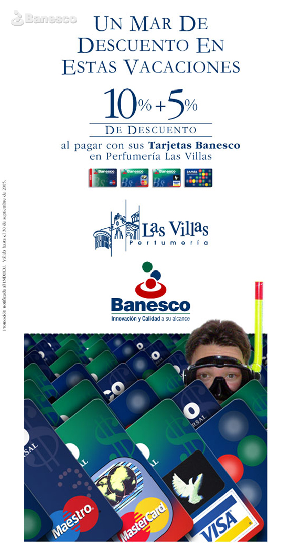 Aviso de promoción de descuentos al pagar con Tarjetas Banesco en Perfumería Las Villas.
