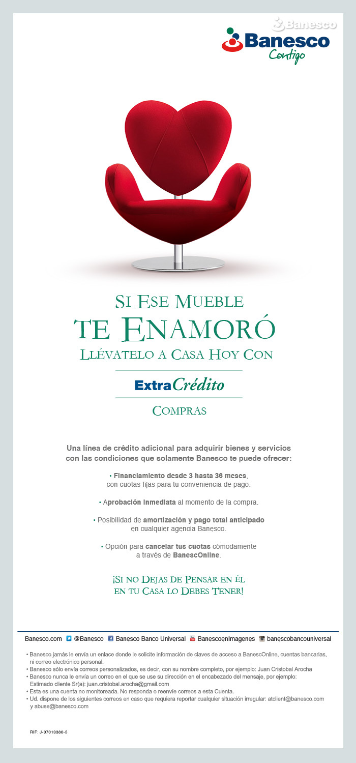 Mailing Impulso ExtraCrédito Compras Banesco por Estacionalidad de San Valentín. "Si ese mueble te enamoró, llévatelo a casa hoy con ExtraCrédito Compras".