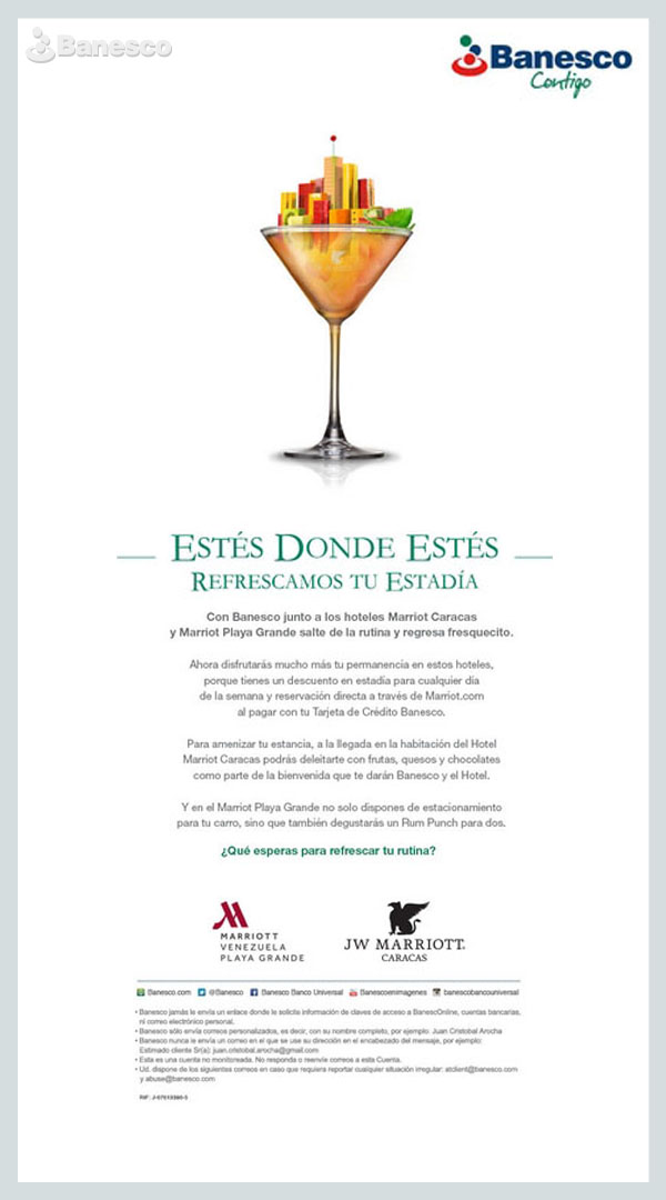 Mailing Impulso alianza Banesco y Hoteles Marriott con descuento en estadía con el uso de la Tarjeta de Crédito Banesco en Hoteles Marriott Playa Grande y JW Marriott Caracas. "Estés donde estés refrescamos tu estadía".