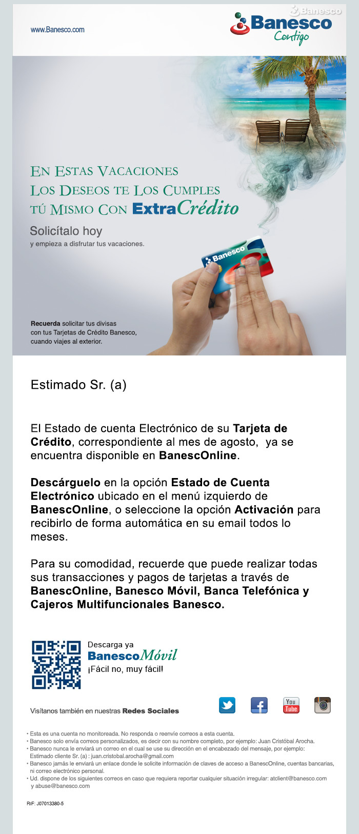 Mailing impulso ExtraCrédito Banesco Por Vacaciones con notificación de estado de cuenta de Tarjeta de Crédito. "En estas vacaciones los deseos te los cumples tú mismo con ExtraCrédito Banesco".