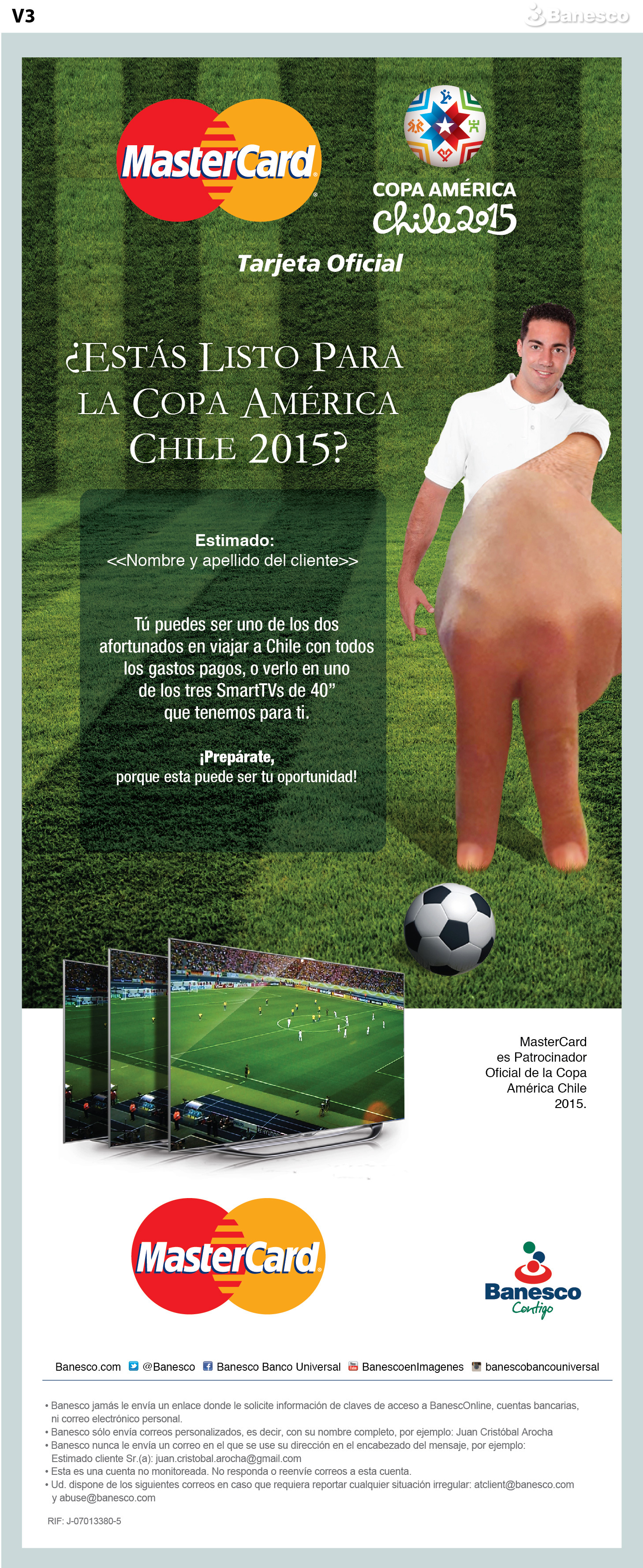 Mailing Focalizado en Premios de la Promoción MasterCard para participar por un viaje a Chile o un SmartTV con la Copa América Chile 2015.