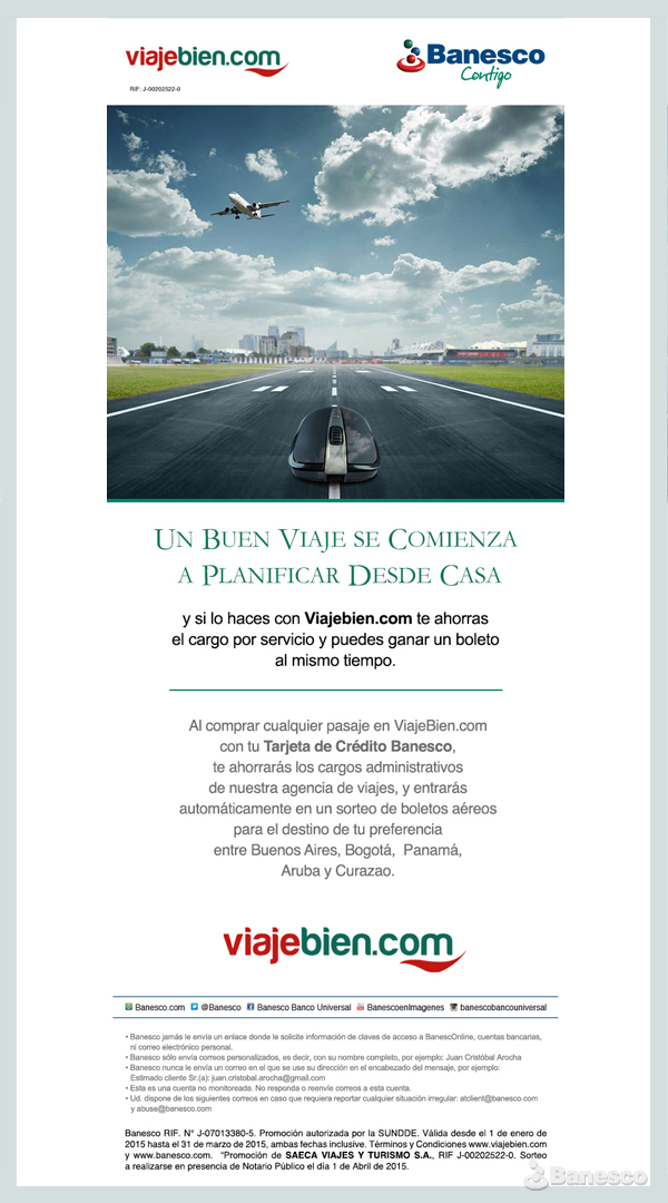 Mailling Alianza Banesco - Viajebien.com con ahorro en cargos administrativos de la agencia de viajes y participación en sorteo de boletos aéreos a Buenos Aires, Bogotá, Panamá, Aruba y Curazao. "Un buen viaje se comienza a planificar desde casa".